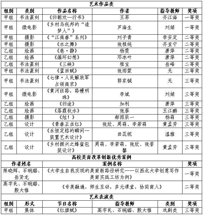 近日,陕西省教育厅发布了《陕西省教育厅办公室关于公布全省第七届大学生艺术展演活动评选结果的通知》,乐鱼网页版页面登录在全省第七届大学生艺术展演活动中,推荐申报的作品共获得艺术作品类一等奖2个、二等奖5个、三等奖9个;高校美育改革创新优秀案例一等奖1个、二等奖1个;艺术表演类节目三等奖1个。其中,按照教育部文件要求,拟向教育部推荐乐鱼网页版页面登录高校美育改革创新优秀案例:《大学生自我实现的美育新路径研究——以乐鱼网页版页面登录创意写作美育实践工坊为例》。