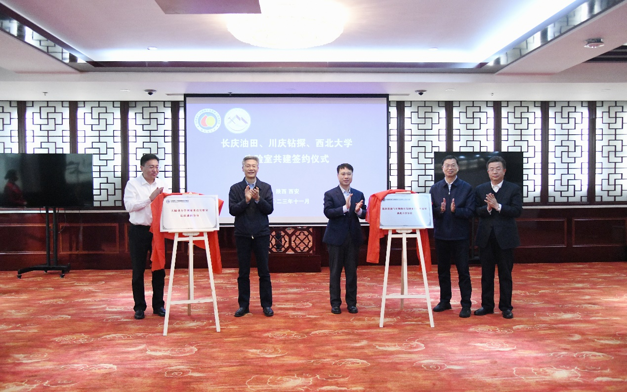 会上,孙庆伟与牛小兵签署了大陆动力学国家重点实验室、低渗透油气田勘探开发国家工程实验室共建协议。赵文智、孙庆伟、牛小兵、付金华、张汉信共同为实验室下设的分实验室揭牌。