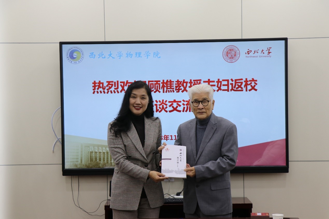 随后,顾樵一行在长安校区参加了座谈交流会。会上,校党委副书记张清代表学校向顾樵赠送了《乐鱼网页版页面登录英才谱》和蓝田玉印章。张清对他长期以来关心和支持母校事业发展表示感谢,并向他介绍了学校目前的发展情况和人才队伍建设情况,希望他继续关心支持学校发展,积极为学校建设贡献智慧和力量,举荐更多海外优秀人才来校工作。顾樵诚挚地感谢学校和学院的关心,表示母校是他一直以来的牵挂,希望继续为学校的事业发展贡献力量,并向学校捐赠了个人近几年出版的专著《数学物理方法》《量子力学Ⅰ》《量子力学Ⅱ》和《生物光子学》。