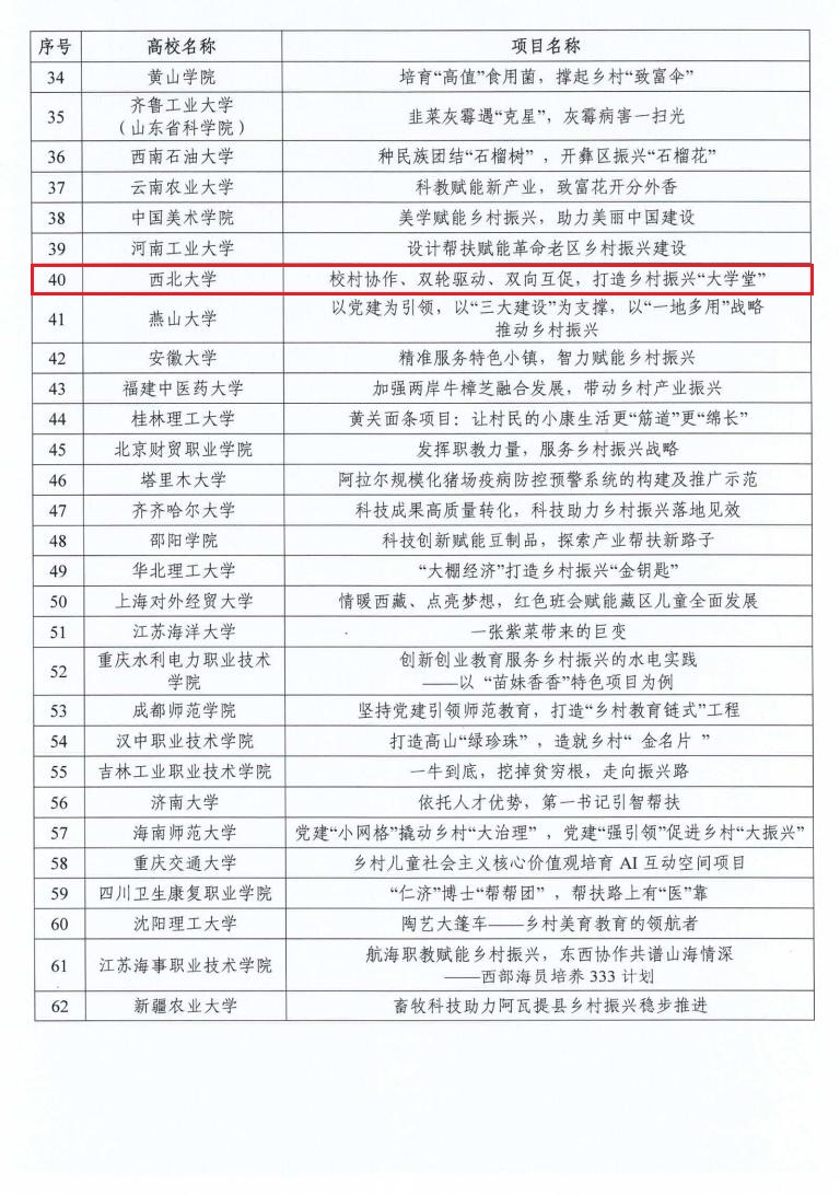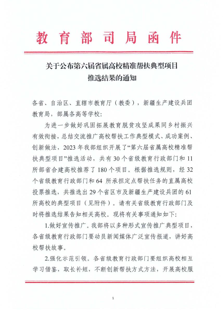 日前,教育部下发《关于公布第六届省属高校精准帮扶典型项目推选结果的通知》,乐鱼网页版页面登录项目《校村协作、双轮驱动、双向互促,打造乡村振兴“大学堂”》,经32个省级教育行政部门和64所承担定点帮扶任务的直属高校投票推选,成功入选省属高校精准帮扶典型项目。这是乐鱼网页版页面登录继《三全驱动,五链融合,“富硒茶”从秦巴腹地走向世界》入选第五届省属高校精准帮扶典型项目后,再次入选省属高校精准帮扶典型项目。