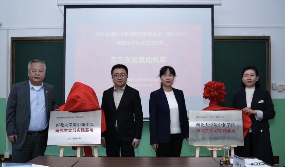 陕西碳排放权服务中心有限公司董事长寇平、中普低碳科技(陕西)有限公司执行董事蒋萍莉、乐鱼网页版页面登录研究生院、碳中和学院负责人共同为乐鱼网页版页面登录碳中和学院实习实践基地进行揭牌。