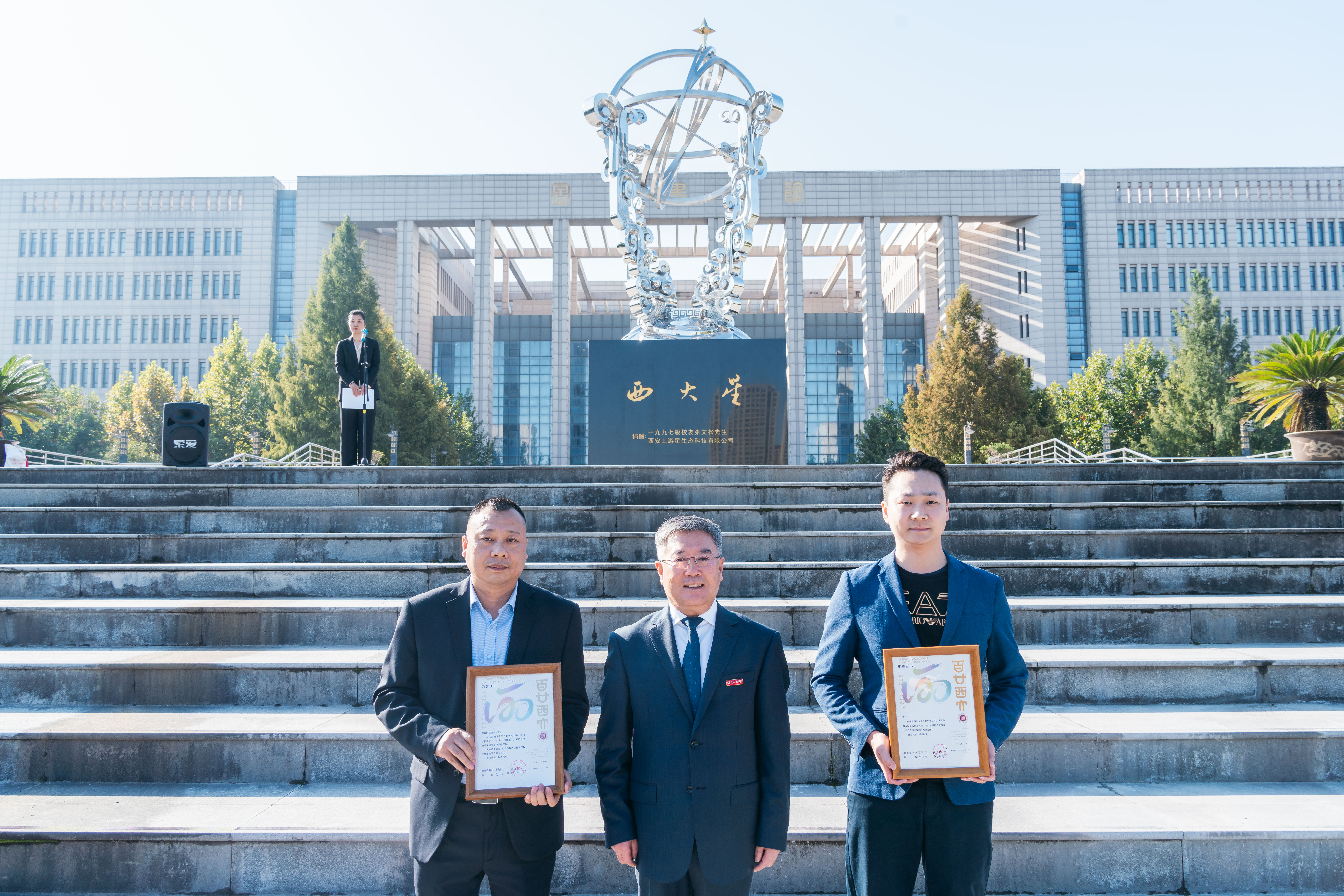 郭立宏、张清、田明纲、董云、张文志为“Xida星”雕塑揭幕。郭立宏为西安上游星生态科技有限公司和西安和其光电科技股份有限公司颁发捐赠证书。
