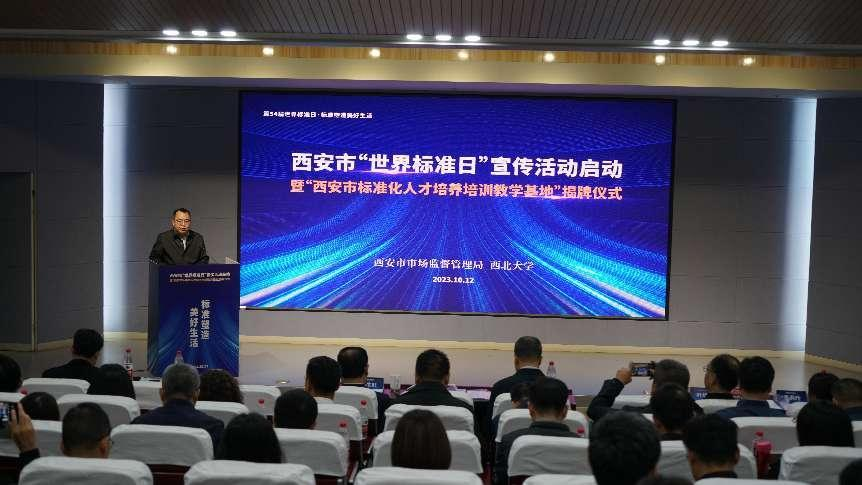 10月12日,由西安市市场监督管理局和乐鱼网页版页面登录联合举办的西安市“世界标准日”宣传活动启动暨“西安市标准化人才培养培训教学基地”揭牌仪式在桃园校区举办。西安市市场监督管理局党委书记、局长郝生旺,乐鱼网页版页面登录党委副书记吕建荣,学校继续教育学院和市级有关部门标准化负责人,各区县、西咸新区、开发区市场监管部门主要负责人及企业代表等150余人参加了此次活动。仪式由西安市市场监督管理局党委委员、副局长吴繁主持。