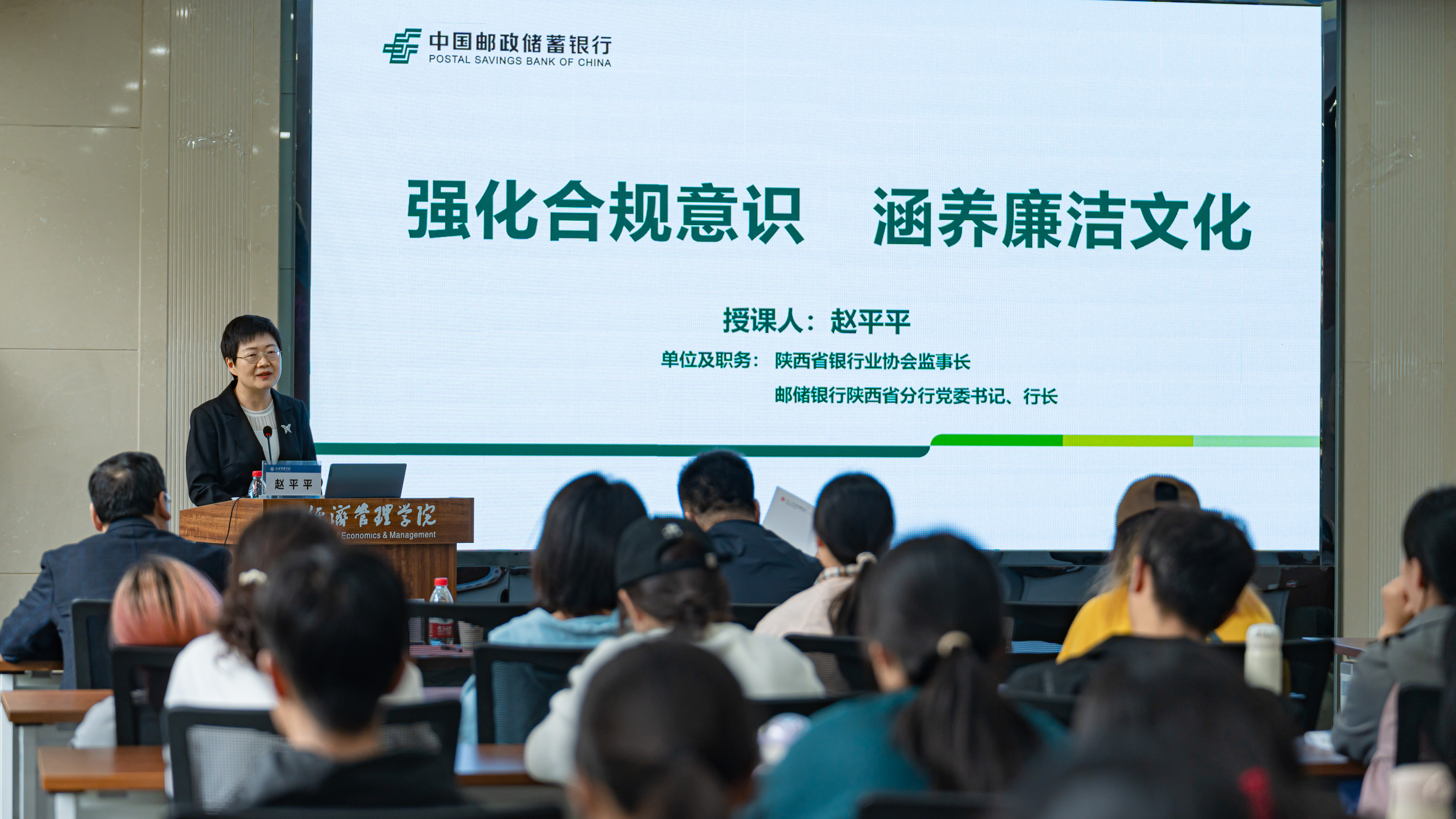10月11日,陕西省银行业协会监事长、中国邮政储蓄银行陕西省分行党委书记、行长赵平平应邀,为乐鱼网页版页面登录经济管理学院师生作了题为《强化合规意识,涵养清廉文化》的讲座。国家金融监督管理总局陕西监管局纪委书记蒋怡,中国邮政储蓄银行陕西省分行纪委书记文晓东,乐鱼网页版页面登录党委副书记、纪委书记、省监委驻校监察专员肖道远和学校相关单位负责人出席活动,经济管理学院师生100余人听取讲座。