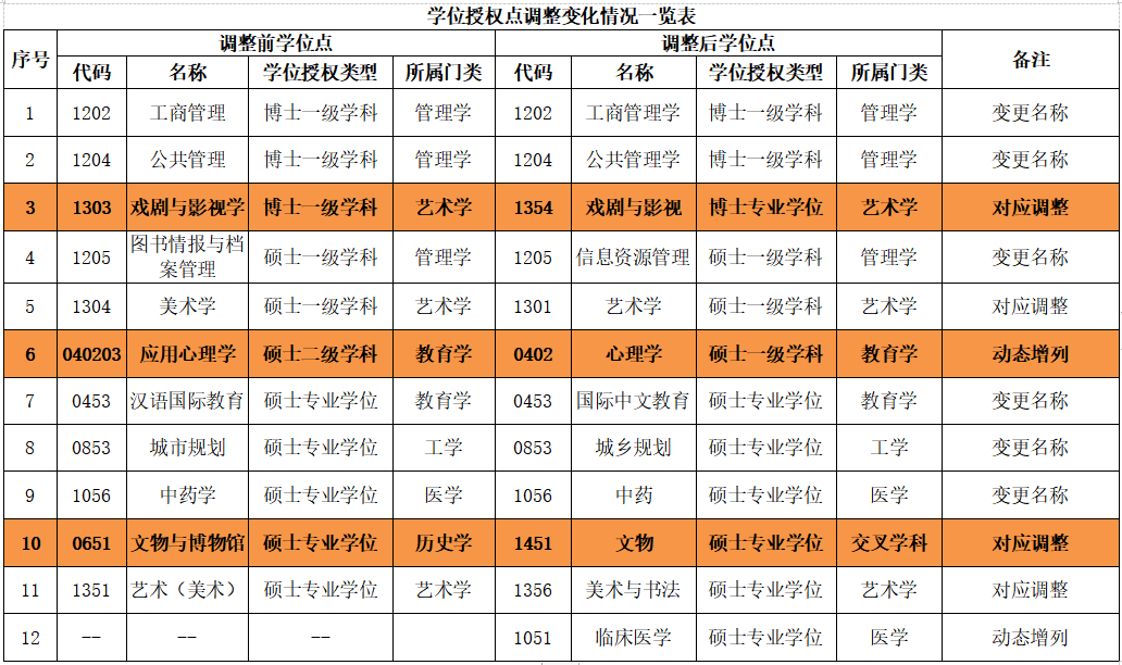 根据《研究生教育学科专业目录(2022年)》及学位授权点调整工作相关文件,学校获批戏剧与影视1个博士专业学位授权类别,艺术学、心理学2个硕士学位授权一级学科,美术与书法、文物、临床医学3个硕士专业学位授权类别。