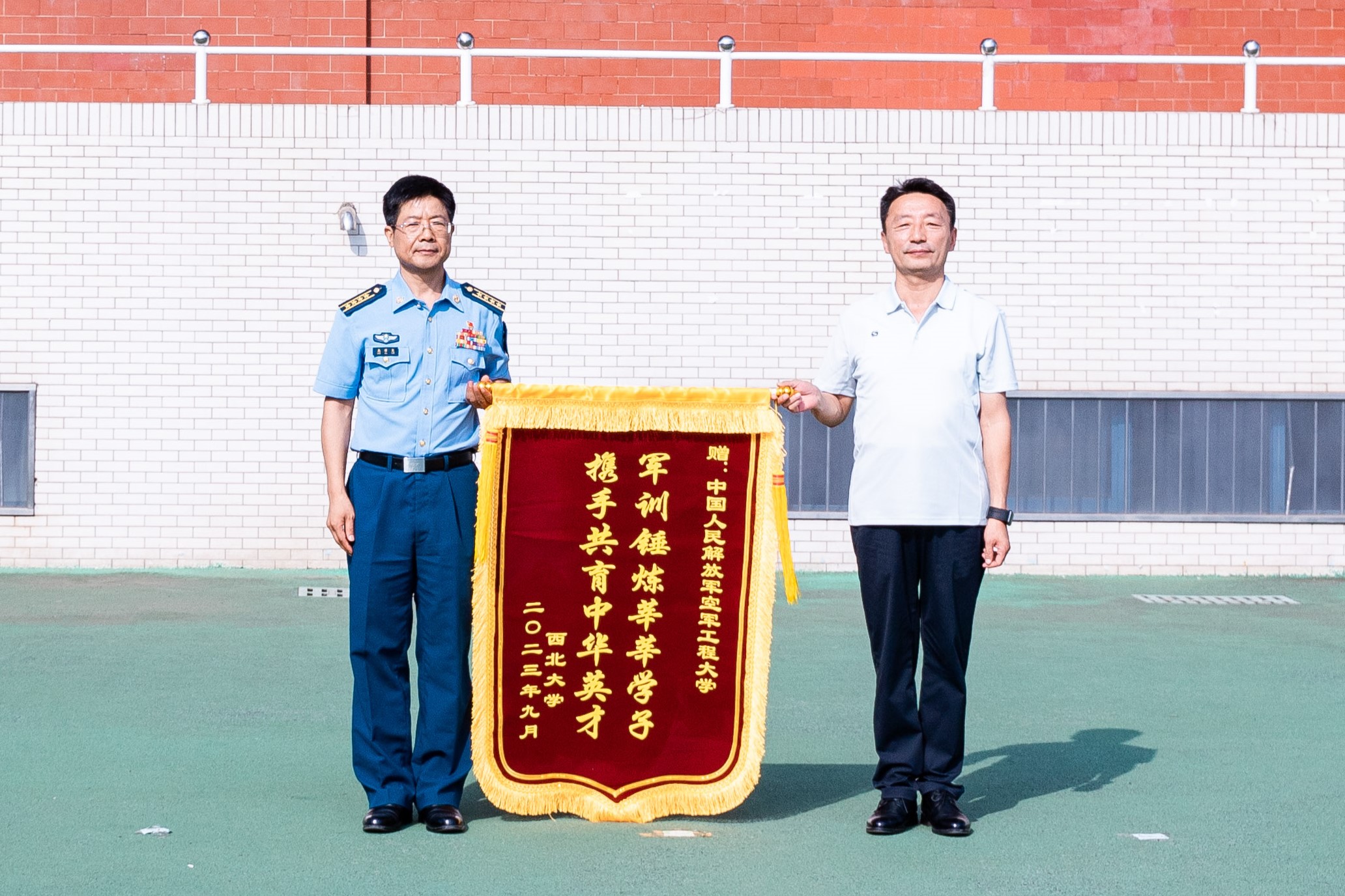 赵作纽代表学校向中国人民解放军空军工程大学信息与导航学院赠送了锦旗。张远军代表学校向中国人民解放军空军工程大学信息与导航学院赠送了学生摄影作品。