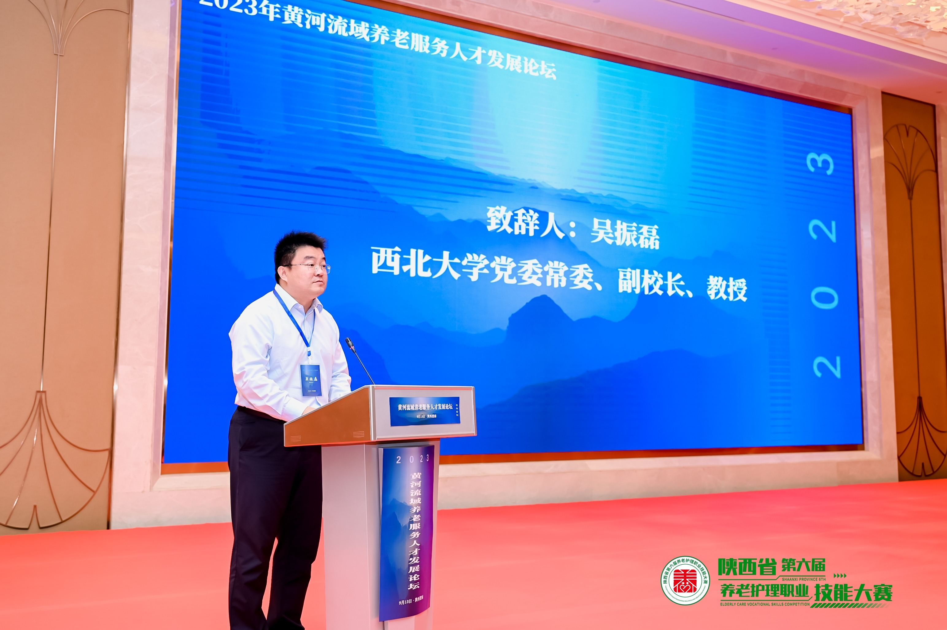 9月13日,黄河流域养老服务人才发展论坛在陕西省渭南市举行。论坛由陕西省民政厅指导、乐鱼网页版页面登录公共管理学院和西安交通大学公共政策与管理学院主办,乐鱼网页版页面登录健康养老研究院和渭南市民政局承办。民政部社会福利中心党委副书记、副主任徐怀好,乐鱼网页版页面登录党委常委、副校长吴振磊,陕西省民政厅二级巡视员曹天刚出席开幕式并致辞。中国社会保障学会副会长、乐鱼网页版页面登录公共管理学院席恒教授主持论坛开幕式。来自天津、山西、内蒙古、山东、河南、广东、重庆、四川、甘肃、青海、宁夏、新疆、陕西等省份民政系统、养老服务领域一线工作者,从事养老服务研究的专家学者等参会。