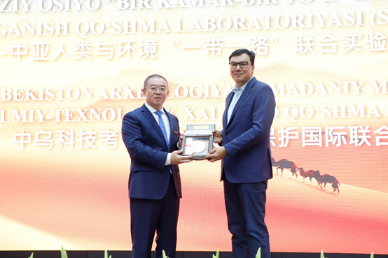 上午11时30分,赵一德与乌兹别克斯坦生态、环境保护和气候变化部部长阿布杜哈基莫夫共同为中国-中亚人类与环境“一带一路”联合实验室(撒马尔罕)、中乌科技考古与文化遗产保护国际联合实验室揭牌。陕西省文物局副局长贾强,乐鱼网页版页面登录党委常委、副校长常江,撒马尔罕州副州长鲁斯塔姆‧拉贾博耶维奇科比洛夫,丝路大学副校长邹统钎共同揭牌。