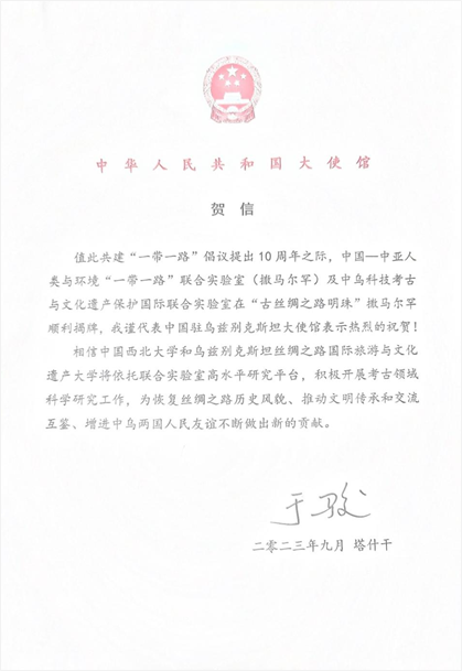 中国驻乌兹别克斯坦大使馆发来贺信,祝贺中国-中亚人类与环境“一带一路”联合实验室(撒马尔罕)、中乌科技考古与文化遗产保护国际联合实验室顺利揭牌,希望双方依托联合实验室高水平研究平台,积极开展考古领域科学研究工作,为恢复丝绸之路历史风貌、推动文明传承和交流互鉴、增进中乌两国人民友谊不断做出新的贡献。