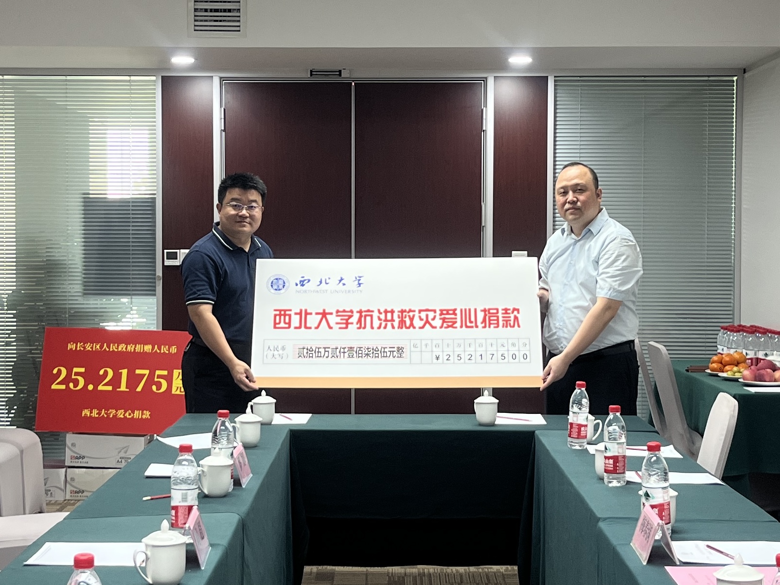 校党委常委、副校长吴振磊代表全校教职工把捐款送到长安区政府手中