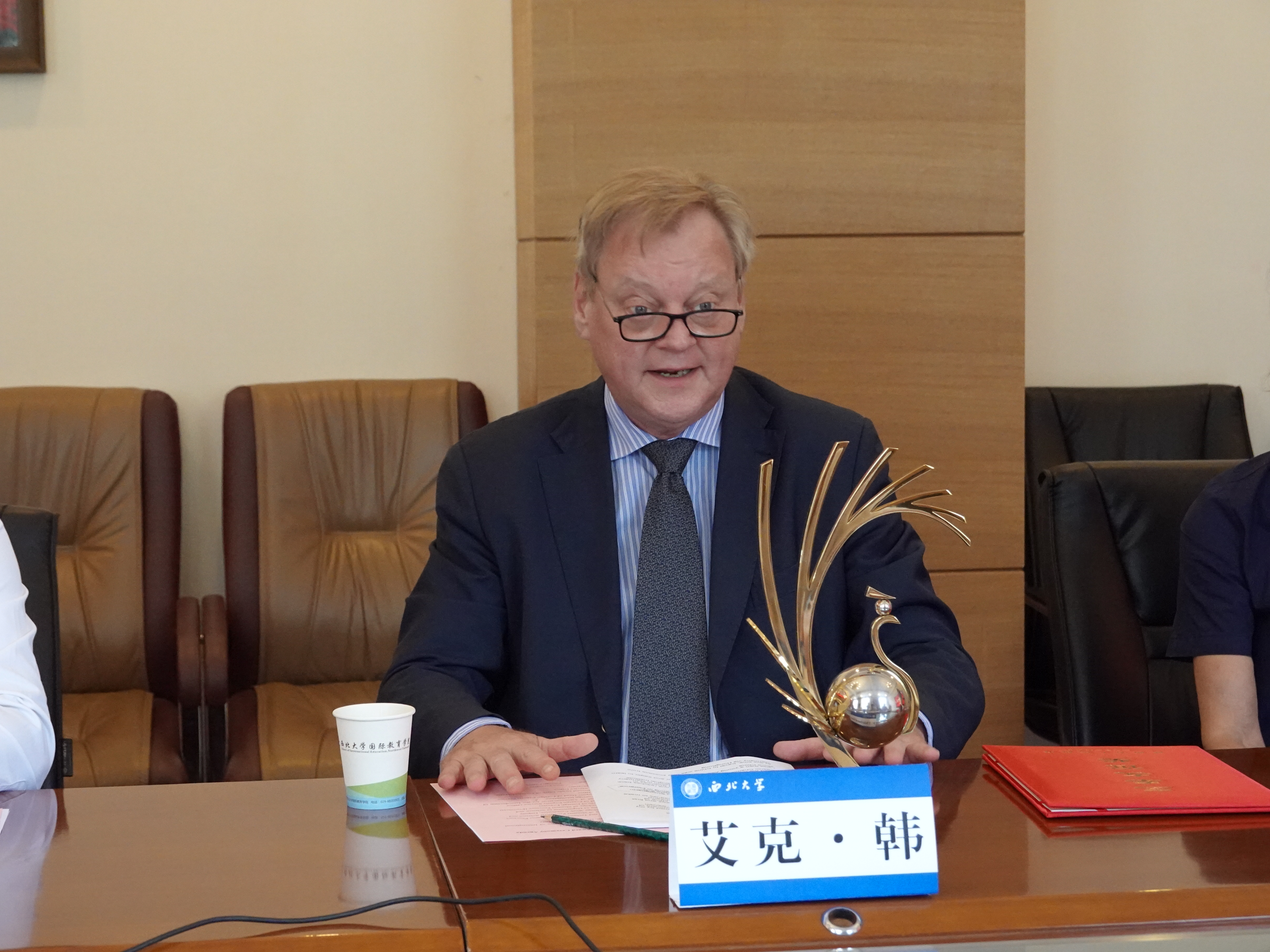 7月21日上午,省科技厅(省外国专家局)副厅长白崇军一行来校为乐鱼网页版页面登录德国籍专家艾克·韩教授颁发2021年度陕西省“三秦友谊奖”。该奖项是陕西省人民政府授予在陕工作外国专家的最高奖项,旨在表彰在我省经济社会发展和促进中外合作交流中作出突出贡献的外国专家。