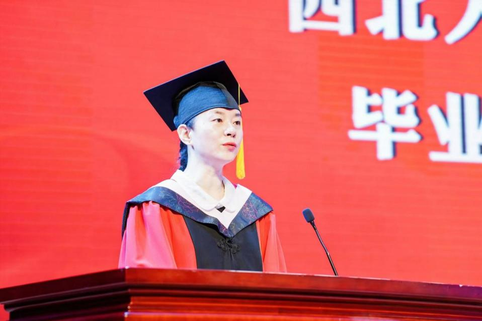 西安莲湖文化旅游集团有限公司副总经理董雪代表毕业生发言。她结合在校学习期间的点点滴滴和所感所获,在毕业之时,表达了对母校深深的感激和不舍之情。