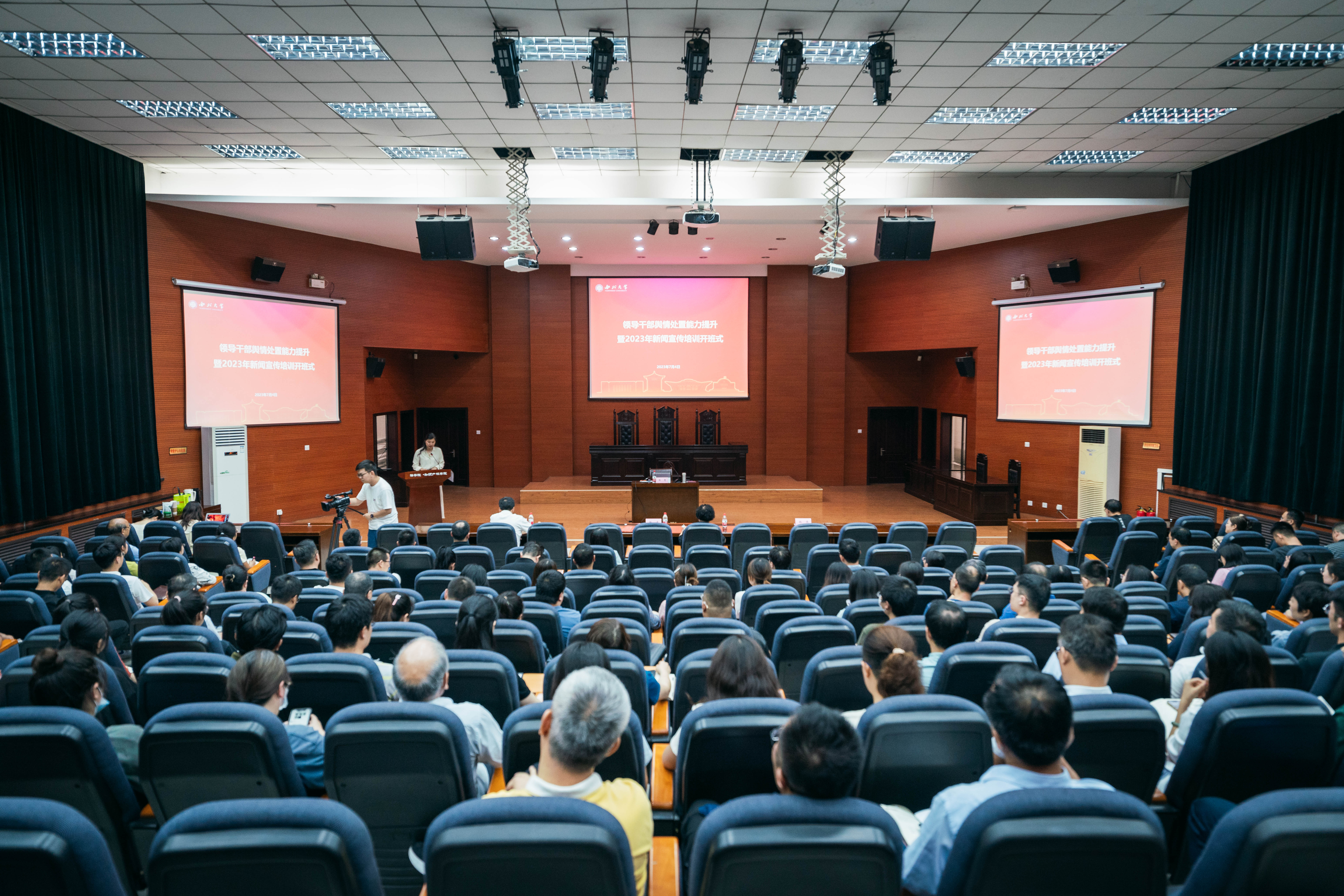 7月4日,乐鱼网页版页面登录领导干部舆情处置能力提升暨2023年新闻宣传培训班在长安校区开班。校党委副书记张清出席并作动员讲话,新闻传播学院教授、博士生导师、新媒体研究院执行院长韩隽作了题为“全媒体背景下网络公共事件传播规律与舆论引导”的报告。校内各单位负责人和师生通讯员200余人参加。开班式由校党委常委、宣传部部长田明纲主持。