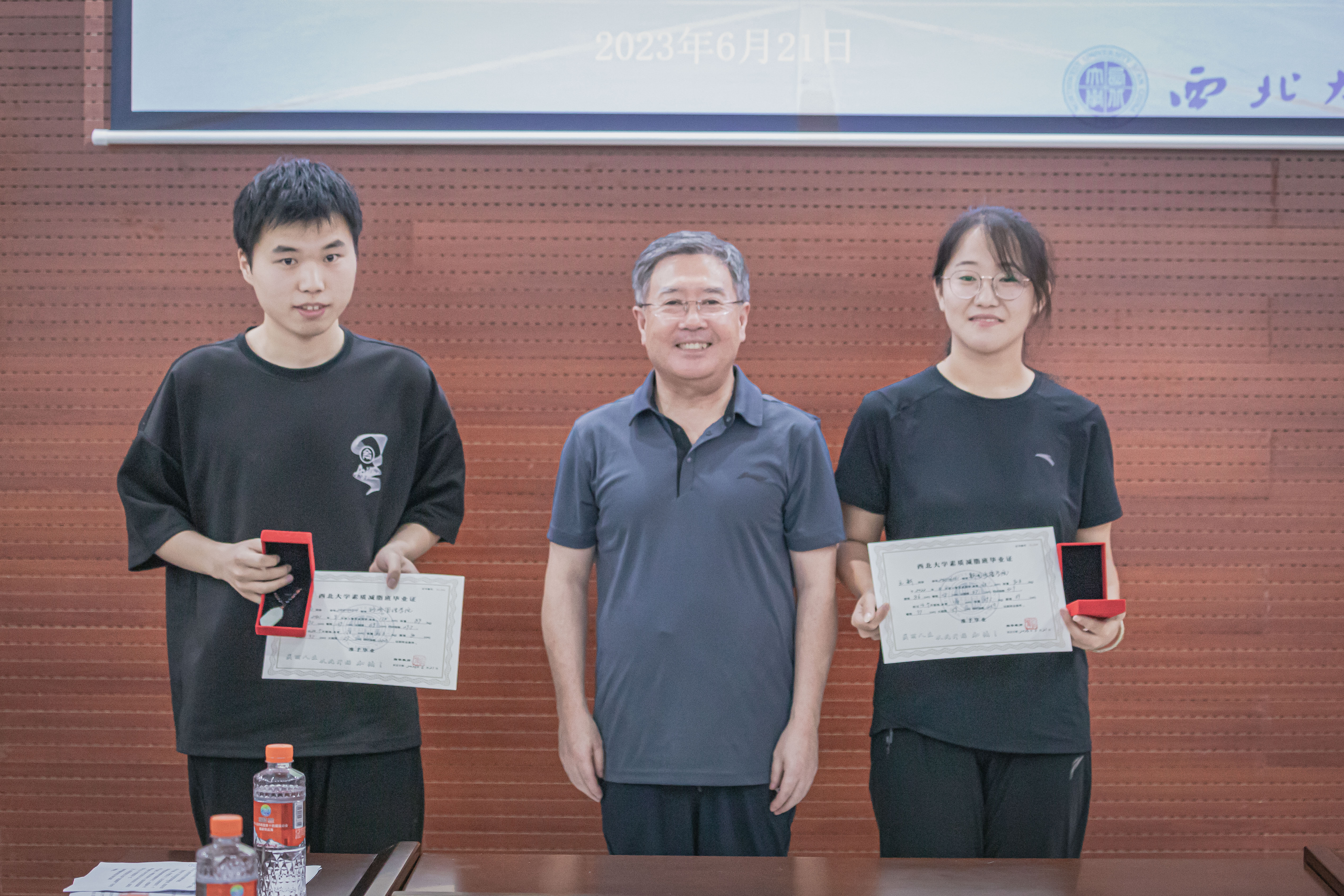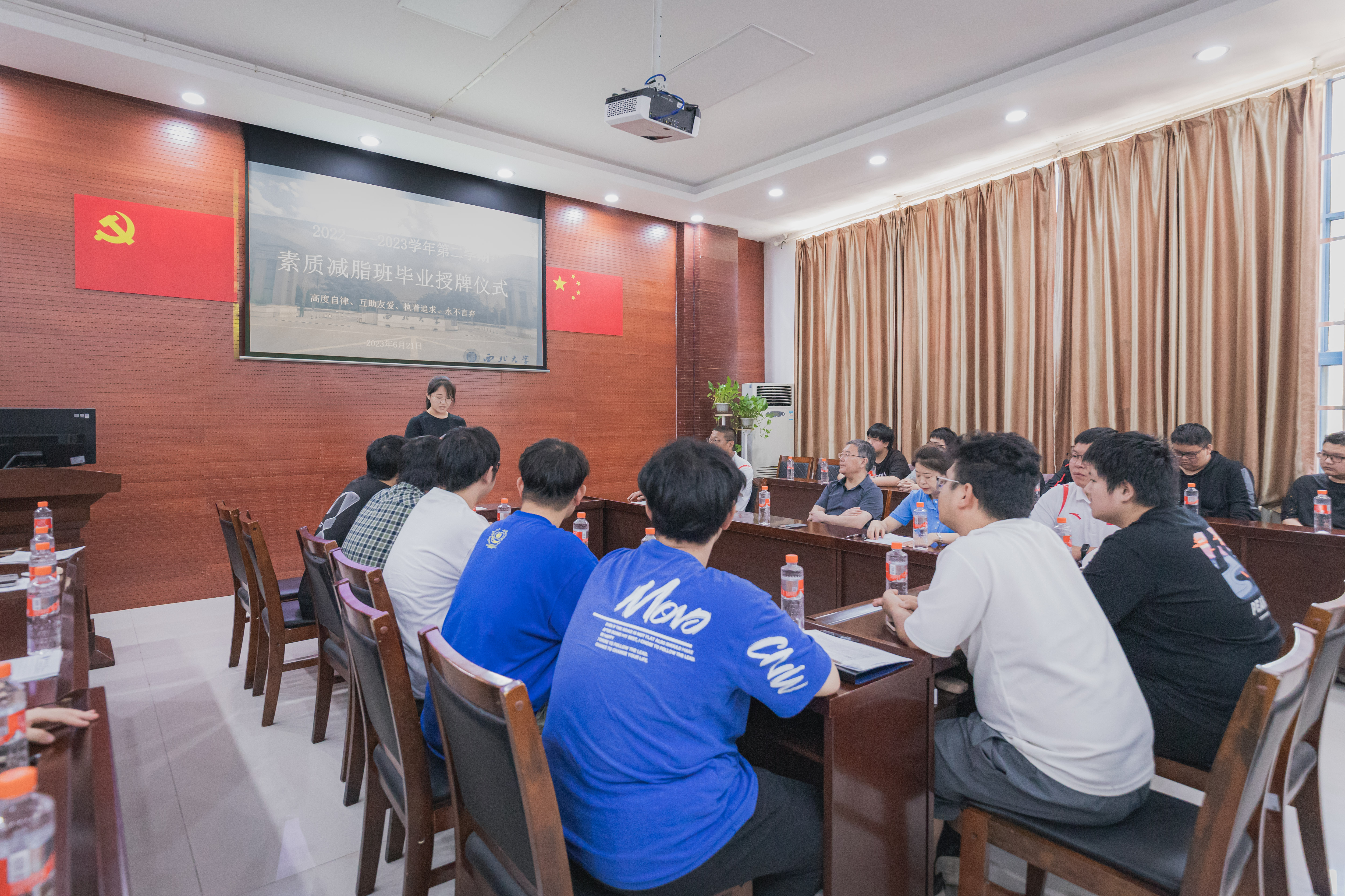仪式上,体育教研部相关负责人介绍了“素质减脂班”开课情况。郭立宏为该班毕业新闻传播学院学生王新和经济管理学院学生韩洪鹏颁发毕业证书和纪念牌。证书上记录着学生的减脂过程和相应数据,纪念牌上正面刻有“胖”字样,背面是校徽和每位学生的唯一编号。