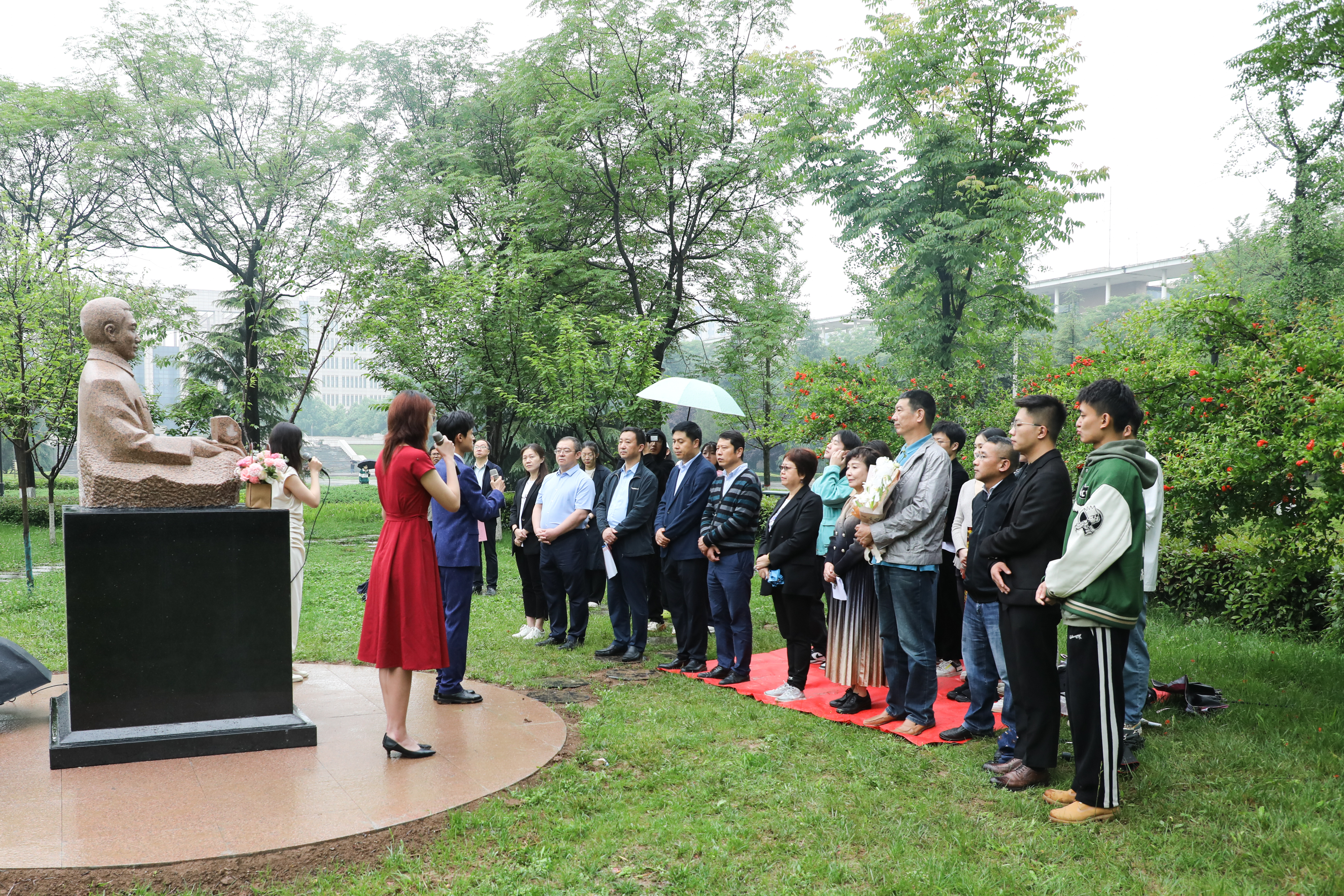 常江、张耀、教师代表马锋、周东华共同为塑像揭幕。西大学子为齐越先生塑像敬献花篮。