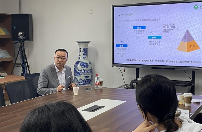 王辉提出,国际中文教育的本质是“区域国别研究视角下的国际中文教育”,其具体含义是对某一国家或区域的政治、经济、历史、文化、社会等相关领域的全方位和跨学科研究,涉及地区确定、资料收集、语言培训、综合研究及政策建议等多方面的内容,具有“地方性”“整体性”“在地化”“包容性”等特征。他阐释了区域国别研究与国际中文教育交叉融合的内在逻辑,包括学理逻辑、历史逻辑和现实逻辑,并指出了解决国际中文教育发展难题和探索原创理论的迫切需要。王辉介绍了区域国别研究视角下区域国别中文教育研究范式建构和区域国别中文教育的七大研究热点,向师生们提供了多种研究思路和研究方向。他认为,区域国别中文教育研究是国际中文教育的重要研究领域和发展方向,对丰富和完善国际中文教育理论、指导国际中文教育实践具有重要意义。