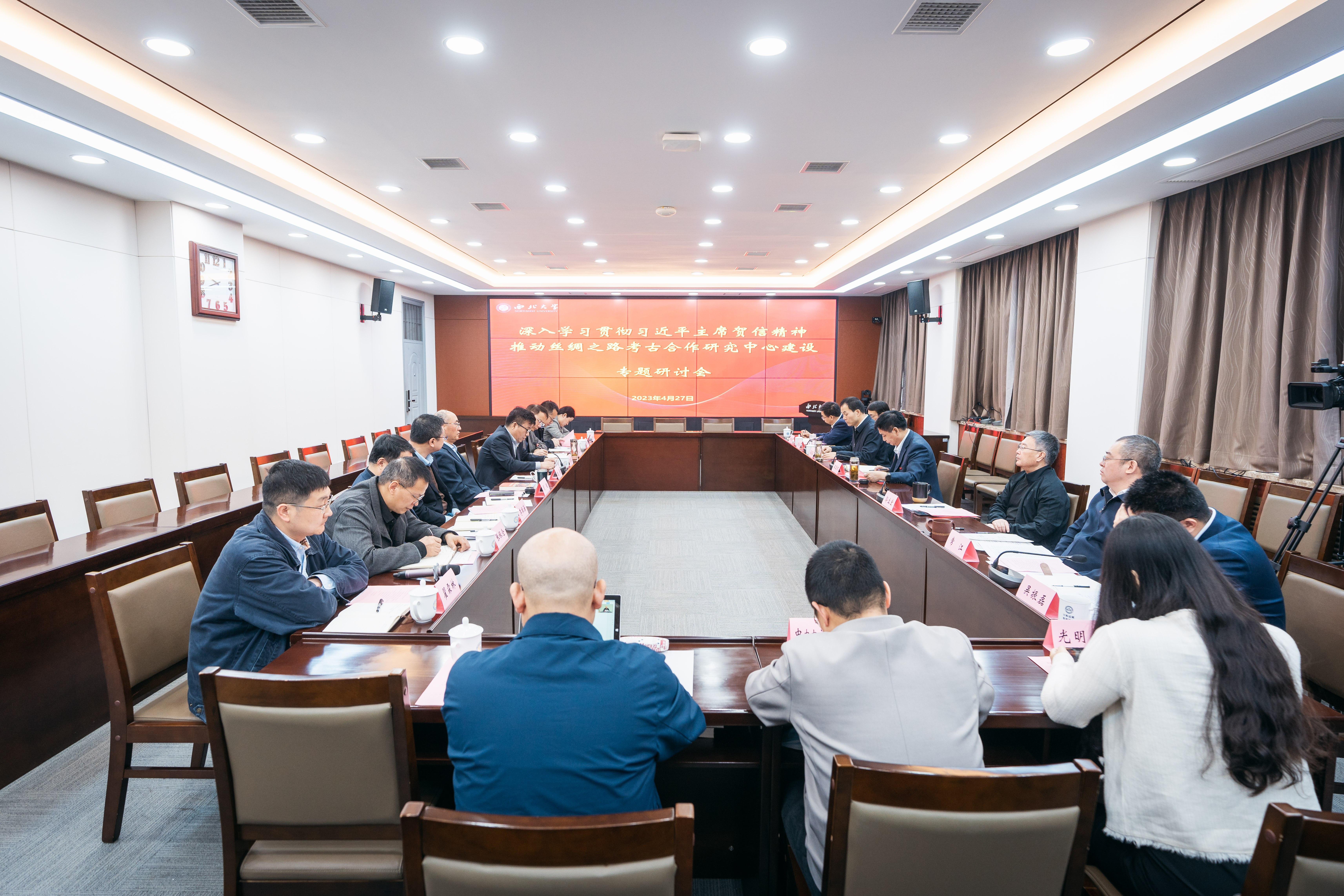 校党委书记王亚杰、校长郭立宏,校党委副书记吕建荣,校党委常委、副校长常江、张远军、吴振磊,校党委常委、宣传部部长田明纲,丝绸之路考古合作研究中心主任赵荣,陕西省考古研究院院长、陕西考古博物馆馆长、丝绸之路考古合作研究中心副主任孙周勇,西安市文物保护考古研究院、国际古迹遗址理事会西安国际保护中心(IICC-X)代表张竟秋,校内有关单位负责人,中央广播电视总台、光明日报、中国社会科学报等媒体代表参加了会议,会议由吴振磊主持。
