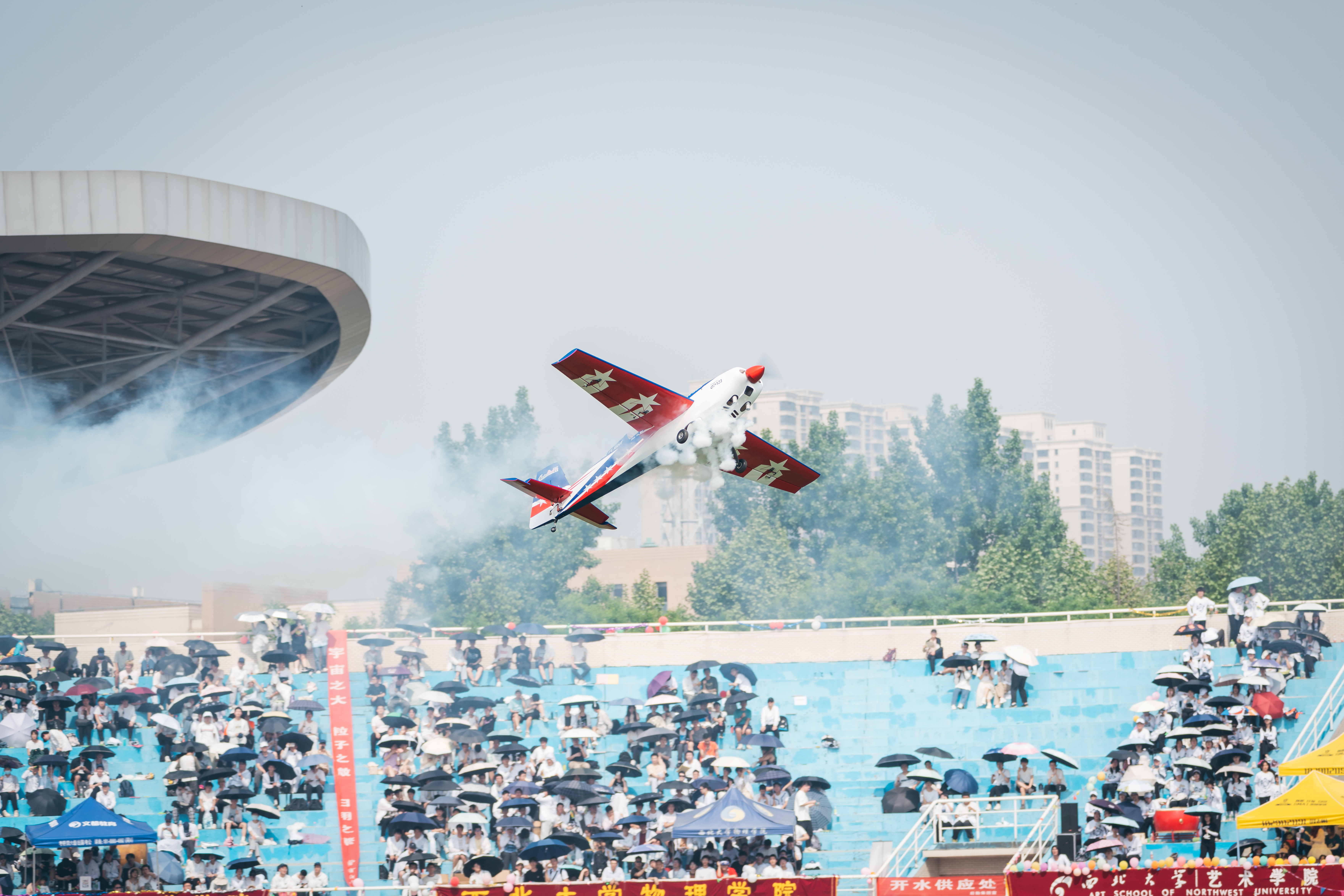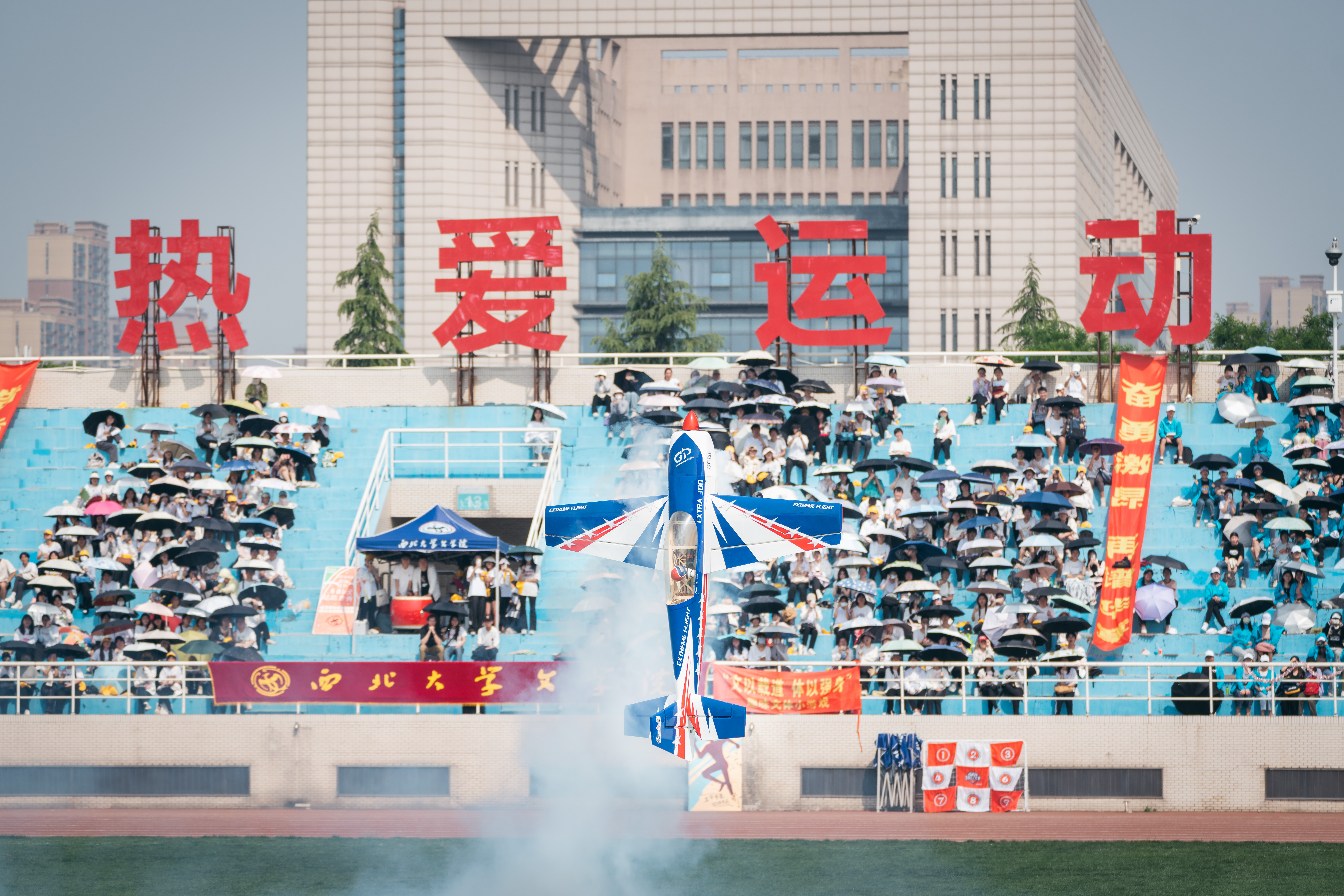 在文艺表演环节,千余名师生轮流登场。375名健美操班的同学给大家带来健美操舞蹈表演,洋溢着西大健康新活力。教职工艺术团的老师们进行了歌舞表演《早安隆回》,TW街舞社的同学表演了hiphop、breaking、locking、popping等四种街舞舞种,用律动的身影诉说澎湃的激情。在一阵马达声中,两架油动特技飞机和两架电动飞机从草地起飞。飞机在空中做出筋斗、滚转、眼镜蛇机动、悬停吊机等高难度的动作,引得在场师生阵阵惊叹与欢呼。