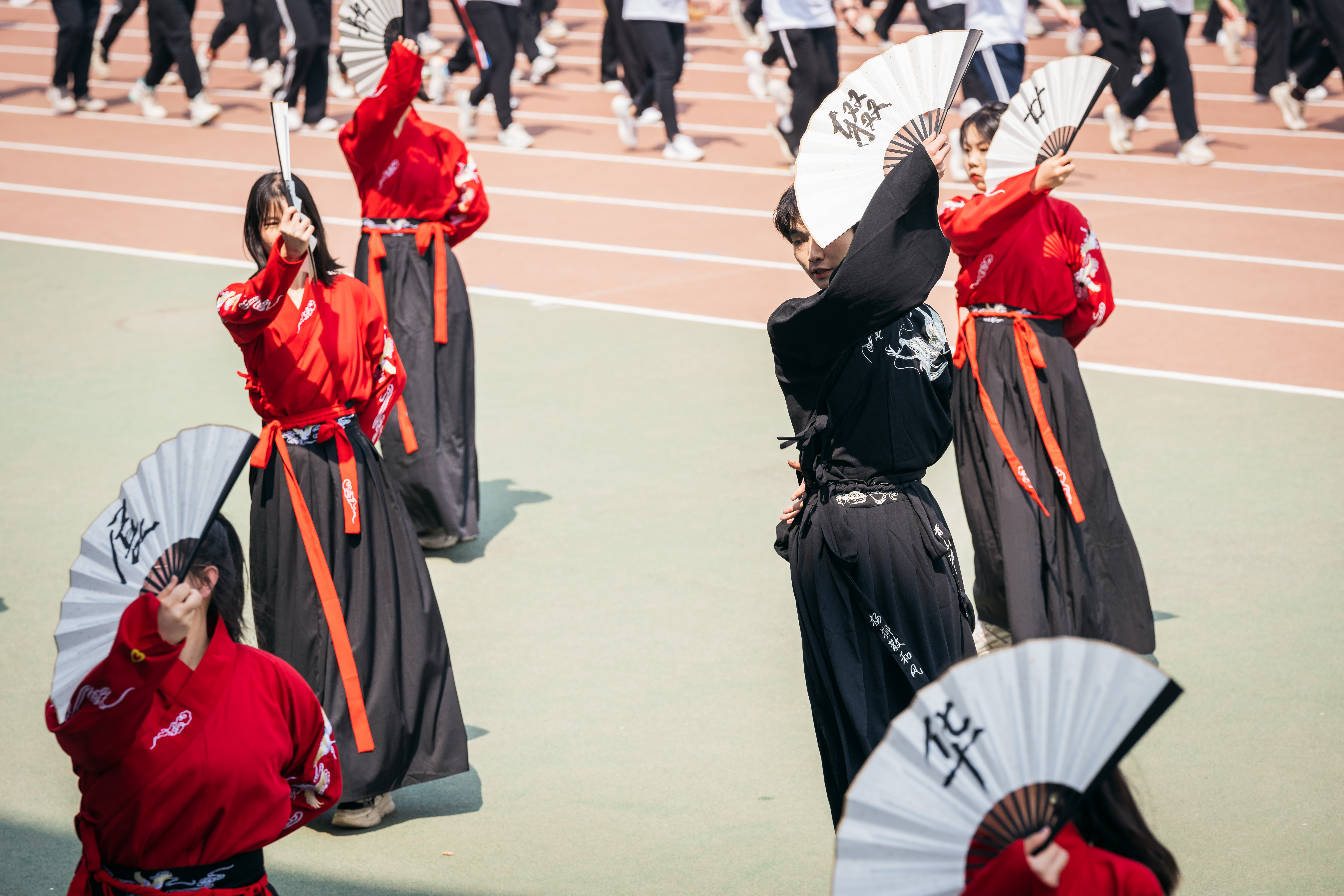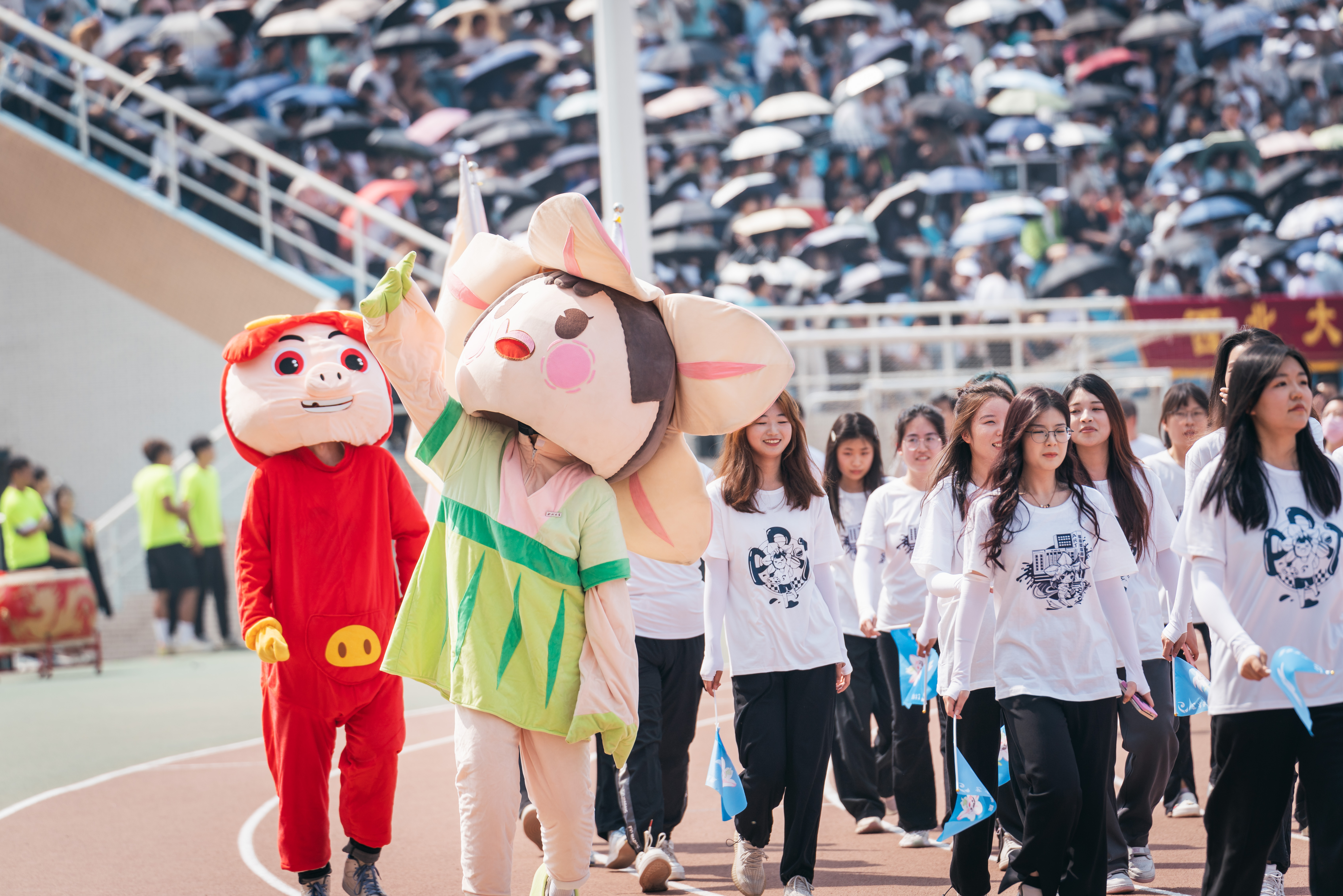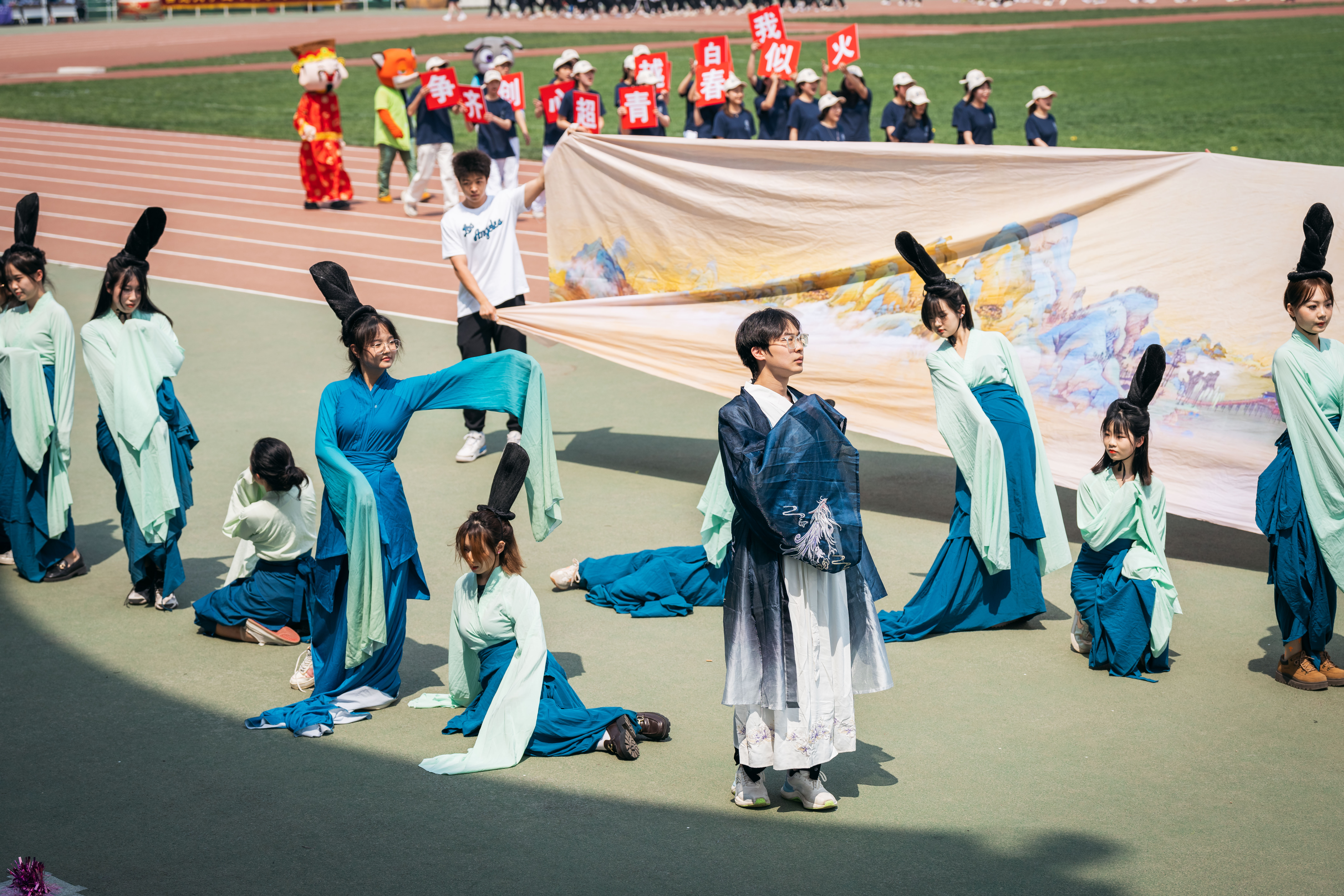 在国旗、校旗和校运会会旗的引导下,花束方阵、彩旗方阵、裁判员方阵、各院(系)和后勤集团、机关分会的师生方阵,身着统一服装,喊着嘹亮的口号,迈着矫健的步伐入场。各个院系结合自身专业特色,或穿着不同民族服饰、或装扮古风绫罗绸缎,翻转手牌、横幅及旗帜,进行了风采展示。