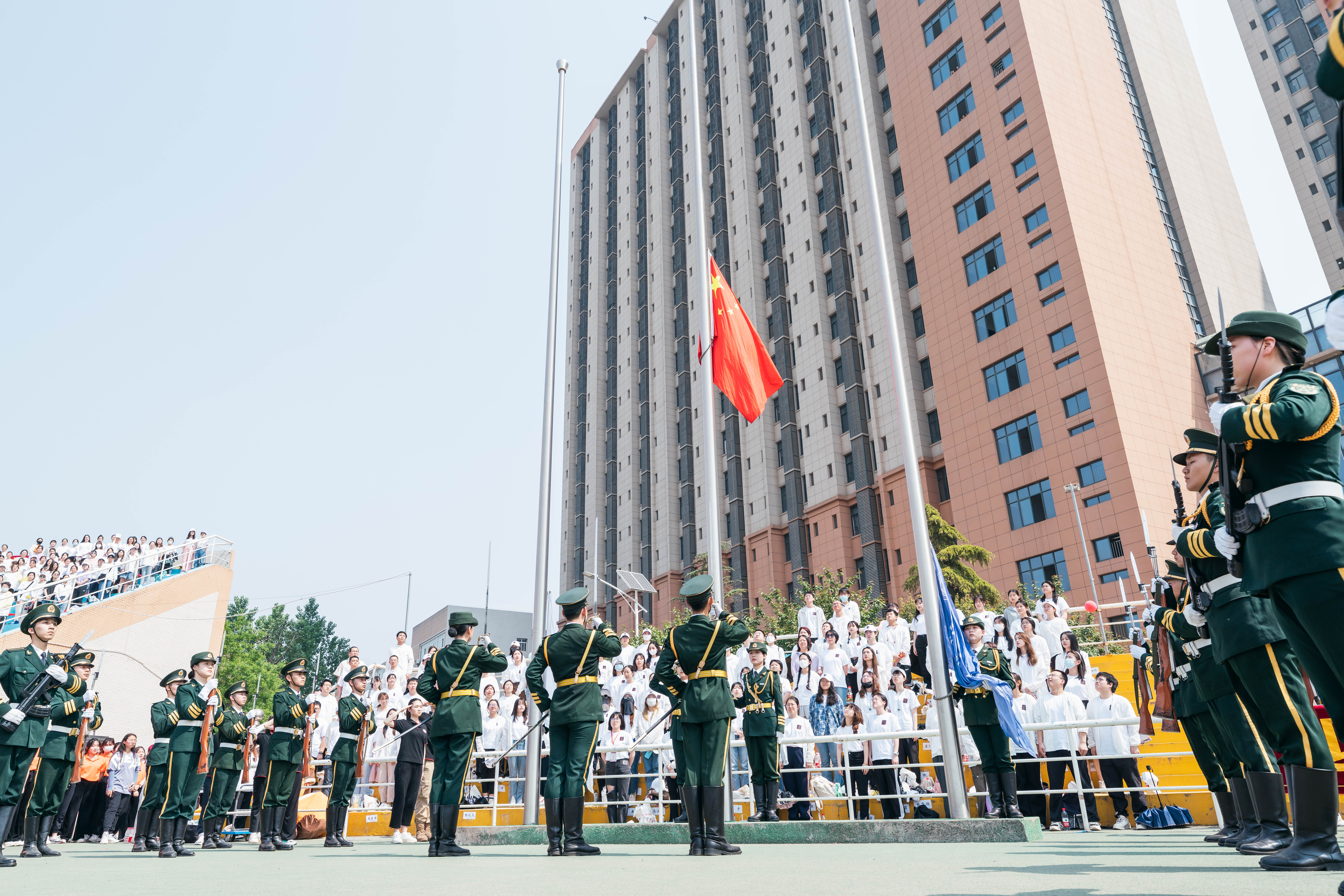 国歌声响起,全体师生向冉冉升起的国旗行注目礼。校旗、会旗随后依次升起。教师代表米鑫、学生代表王凯怡分别发言,米鑫、郑雨涵、童鑫淼分别代表教工运动员、学生运动员、裁判员宣誓。王亚杰宣布体育文化节田径运动会正式开幕。