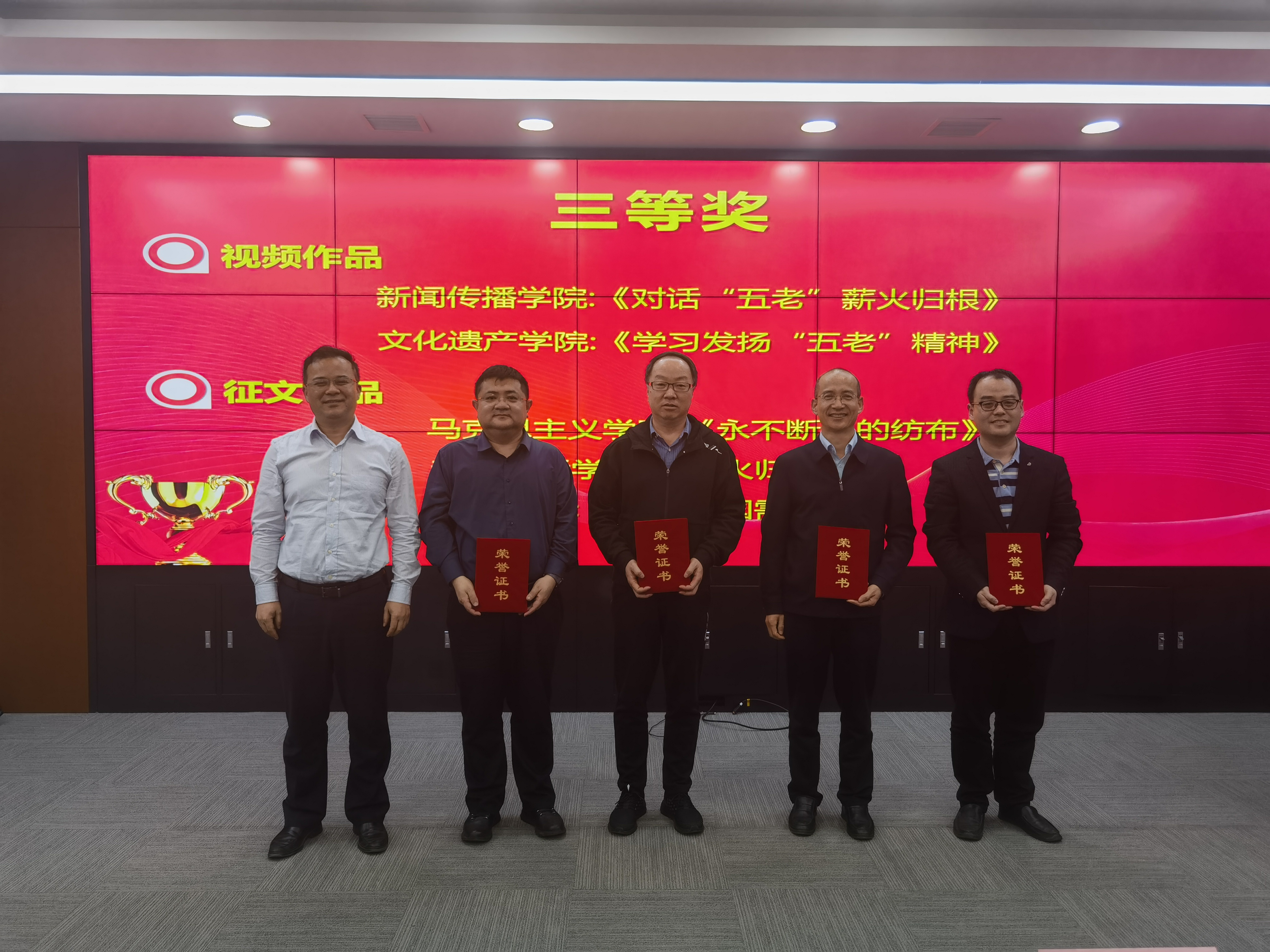 视频会议结束后,乐鱼网页版页面登录在分会场举办了颁奖仪式,关工委秘书长、离退休党委负责人主持仪式。赵作纽、刘续德、奚家米为乐鱼网页版页面登录荣获2022年“读懂中国”活动优秀微视频和优秀征文的单位颁发了荣誉证书,并合影留念。乐鱼网页版页面登录共有14项作品获奖,其中微视频作品一等奖1项,二等奖2项,三等奖2项;征文作品一等奖3项,二等奖3项,三等奖3项。2022年,乐鱼网页版页面登录关工委在全校开展“读懂中国”活动,各院系积极参与,广泛发动组织学生采访本院系知名老专家、老教授以及身边的抗美援朝老兵、老劳模等“五老”先进典型,引导青年学生通过主动学习“五老”精神,传承西大优良学风校风,取得了良好效果。