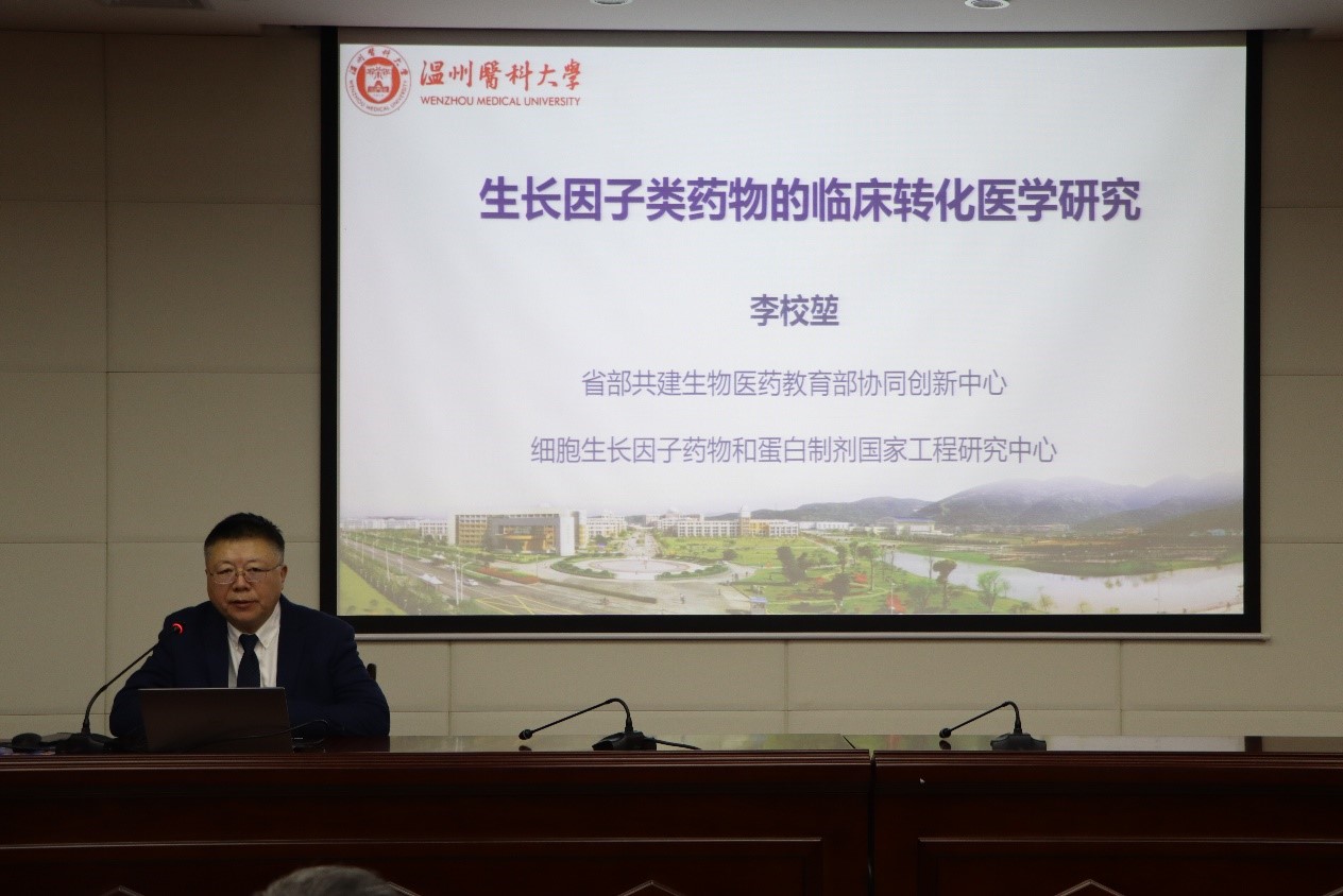 近年来,李校堃院士聚焦FGF对机体代谢稳态的调控作用开展研究,为非促增殖代谢调控FGF变构体的定向改造、代谢疾病新靶点的发现和新药物开发提供了重要理论依据。报告中,李校堃院士系统阐释了FGFs在人类生长发育过程中发挥的重要作用,强调了FGFs的临床转化价值。他指出,FGF创面给药不会引起癌变、不会导致瘢痕增生,能够加速慢性难愈创面主动修复和功能再生,为各类难愈性创面提供了治疗新策略。最后,李校堃院士简要介绍了温州医科大学和再生调控与眼脑健康浙江省实验室的建设发展情况。