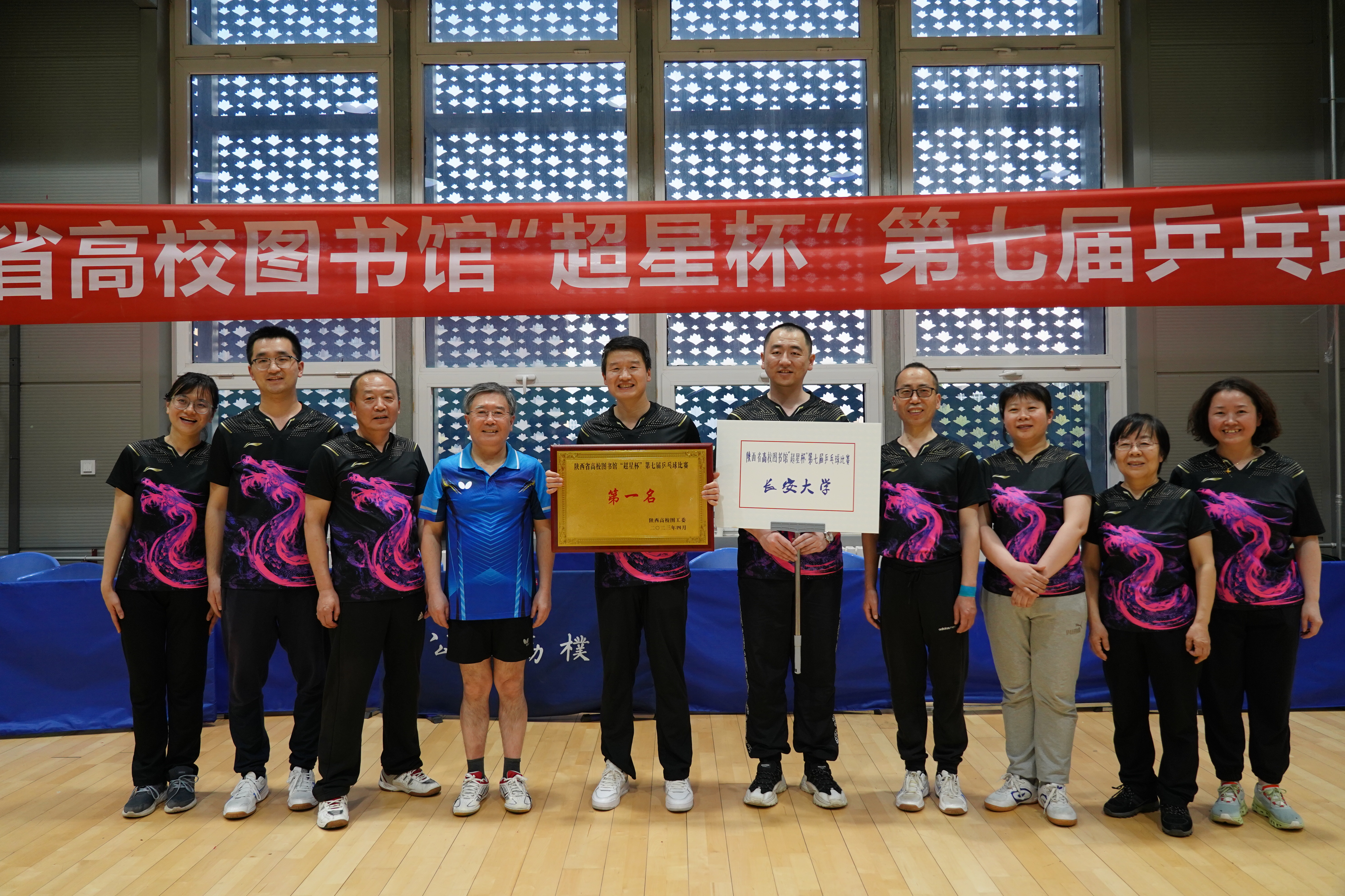 校长郭立宏为获得团体第一名的长安大学代表队颁奖