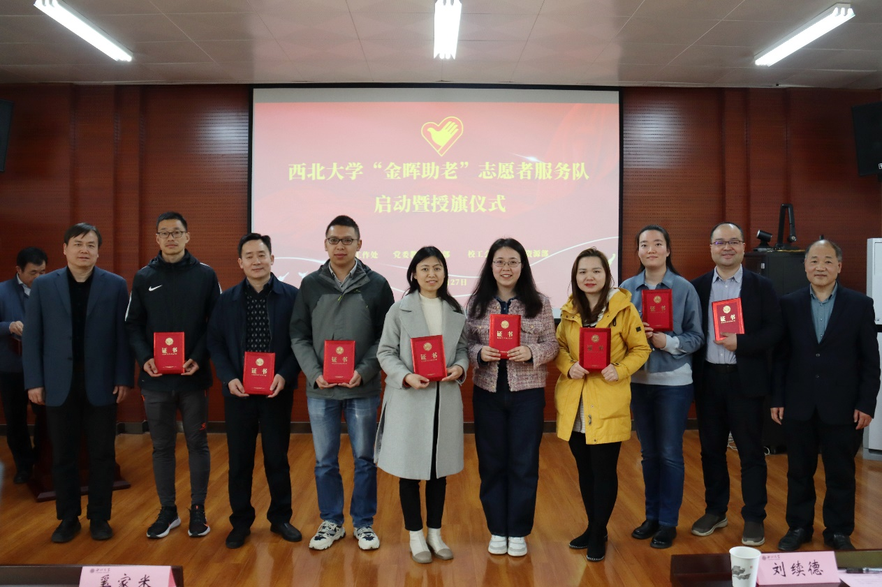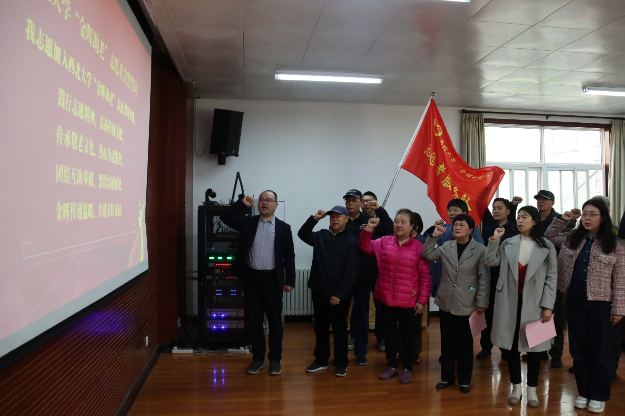 仪式上,奚家米为志愿者服务队授旗,党委教师工作部、校工会、人力资源部、离退休党委负责人为志愿者颁发证书,志愿者们在队旗下庄严宣誓,志愿者代表在发言中表示要用心用情融入“金晖助老”志愿服务,做西大精神的传承者,尽心尽力把助老敬老工作做好。