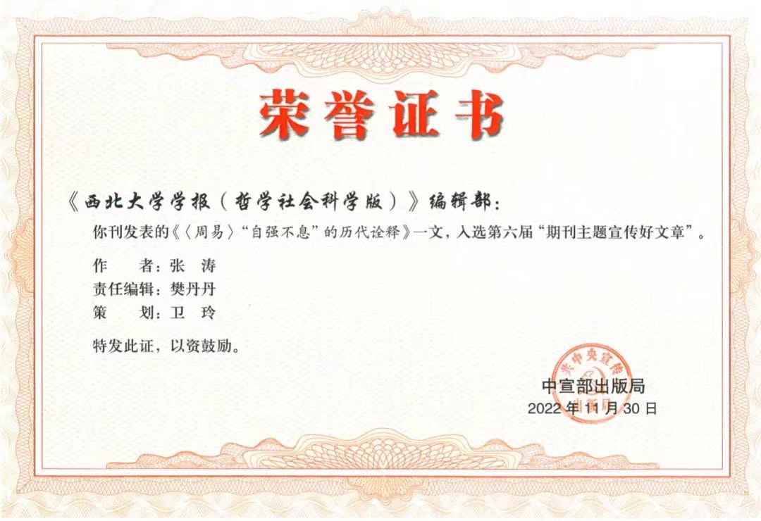 日前,由中宣部出版局主办、中国期刊协会承办的第六届“期刊主题宣传好文章”推荐活动结果在京揭晓,包括《乐鱼网页版页面登录学报(哲学社会科学版)》刊发的《〈周易〉“自强不息”的历代诠释》等91篇(组)文章入选。