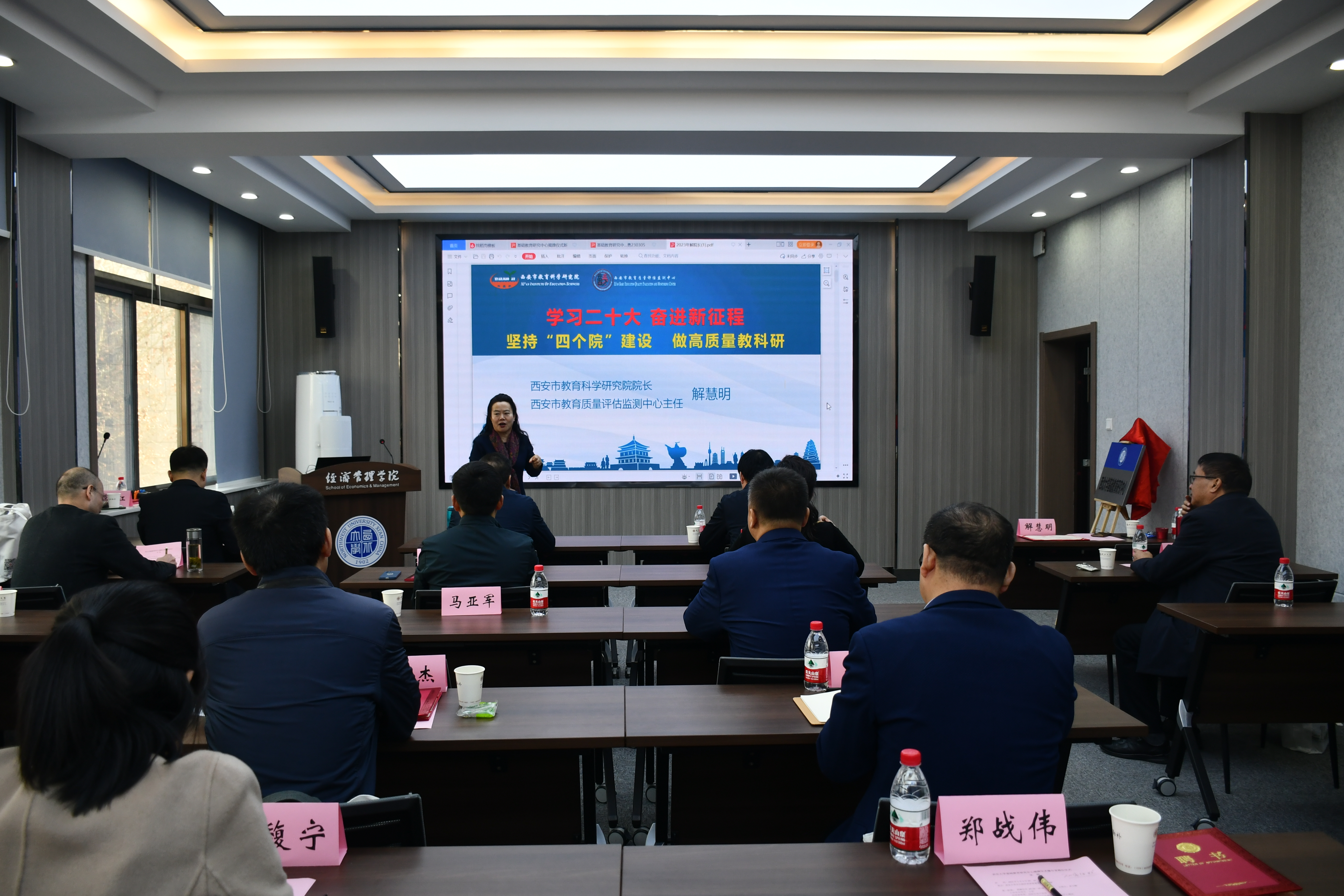 聘任仪式后,西安市教育科学研究院院长、西安市教育质量评估检测中心主任解慧明做《学习二十大,奋进新征程,坚持“四个院”建设,做高质量教科研》的专题报告。