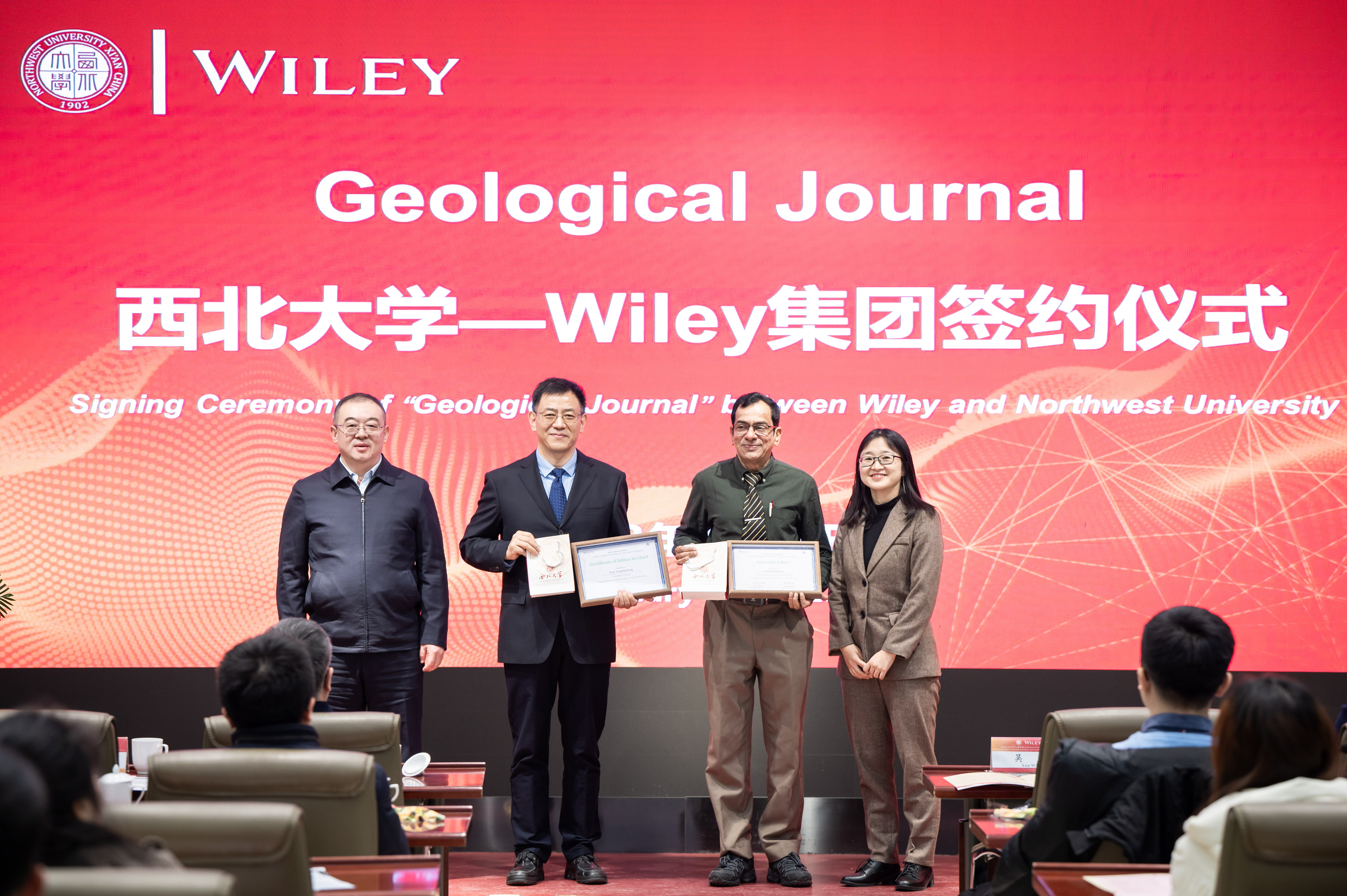 吴燕、常江代表双方签署乐鱼网页版页面登录与Wiley集团合办Geological Journal期刊合作协议,并分别为期刊共同主编董云鹏、期刊编辑指导M. Santosh教授、线下参会期刊副主编颁发聘书和纪念品。