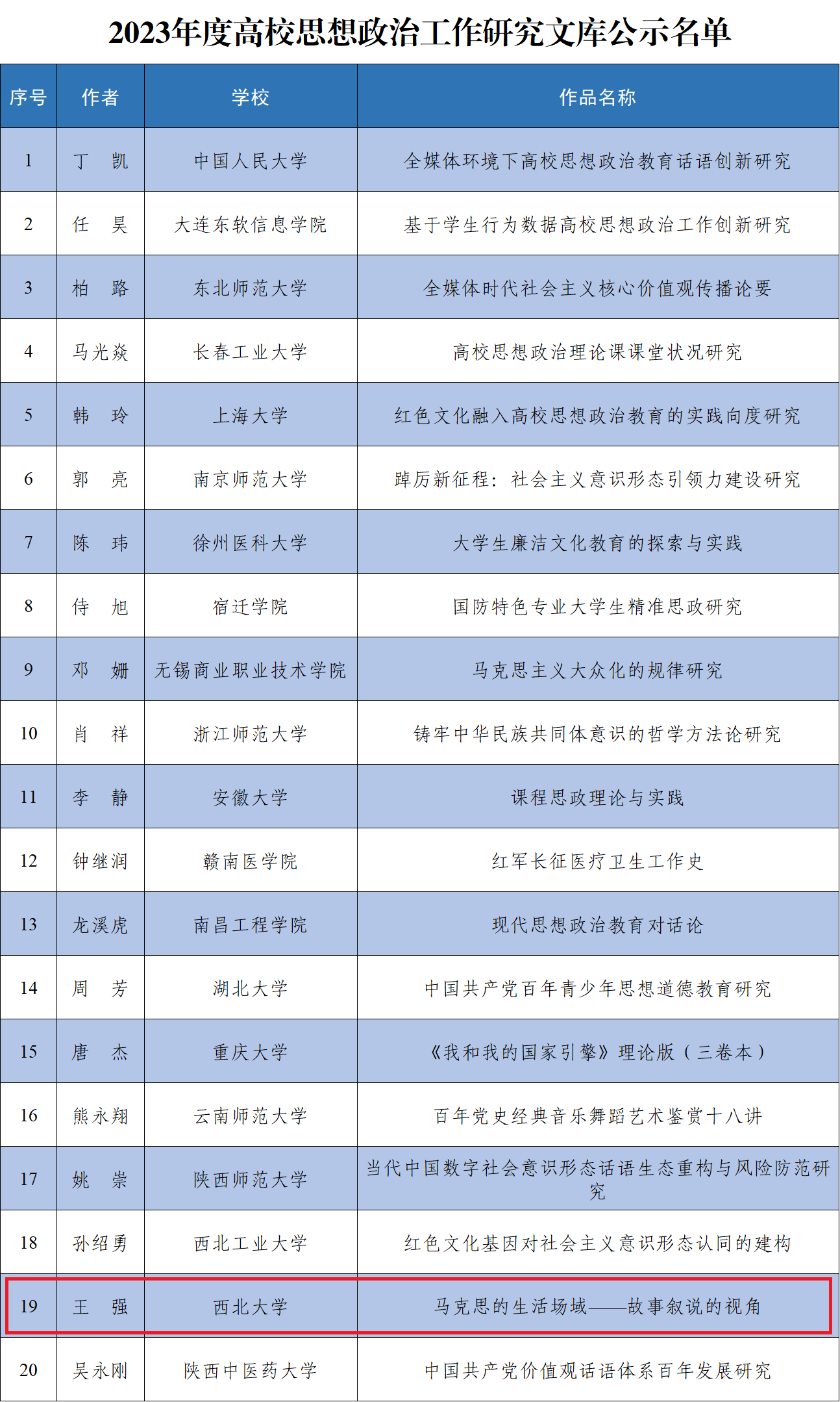 近日,教育部思想政治工作司公布了2023年度高校思想政治工作质量提升综合改革与精品建设项目遴选结果,乐鱼网页版页面登录马克思主义学院常务副院长王强教授主持申报的作品《马克思的生活场域——故事叙说的视角》入选高校思想政治工作研究文库,这也是乐鱼网页版页面登录继2019年首批入选后第二次入选该项目。