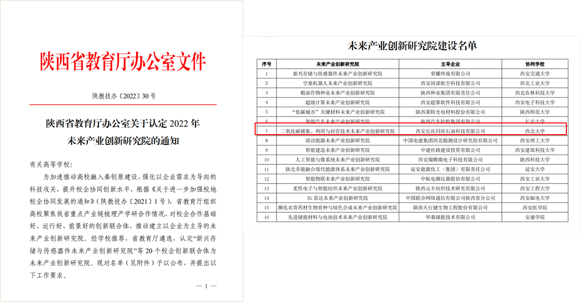 近日,陕西省教育厅发布了《陕西省教育厅办公室关于认定2022年未来产业研究院的通知》,乐鱼网页版页面登录与西安长庆同欣石油科技有限公司共同申报的“二氧化碳捕集、利用与封存技术未来产业创新研究院”获省教育厅认定建设,标志着乐鱼网页版页面登录双碳领域校企联合新型研发平台建设取得了新的进展。