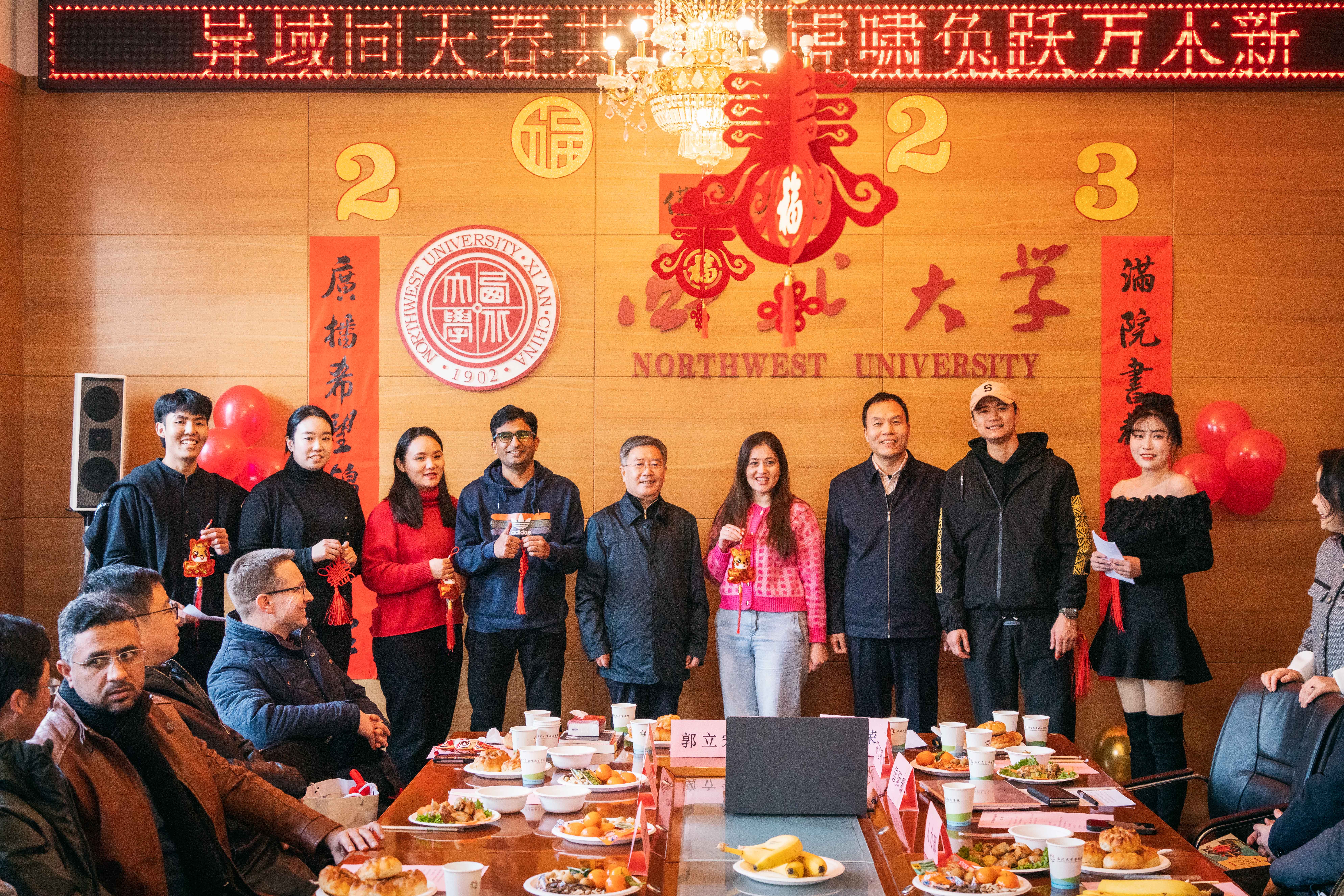 1月19日下午,2023癸卯兔年来临之际,学校举办“异域同天春共暖,虎啸兔跃万木新”2023外籍师生喜迎兔年活动。校长郭立宏、校党委副书记吕建荣带领学校宣传部、学工部、研工部、人力部、国际部(院)和文学院等9个国际学生培养院系负责人,在太白校区看望学校外籍师生并参加活动。