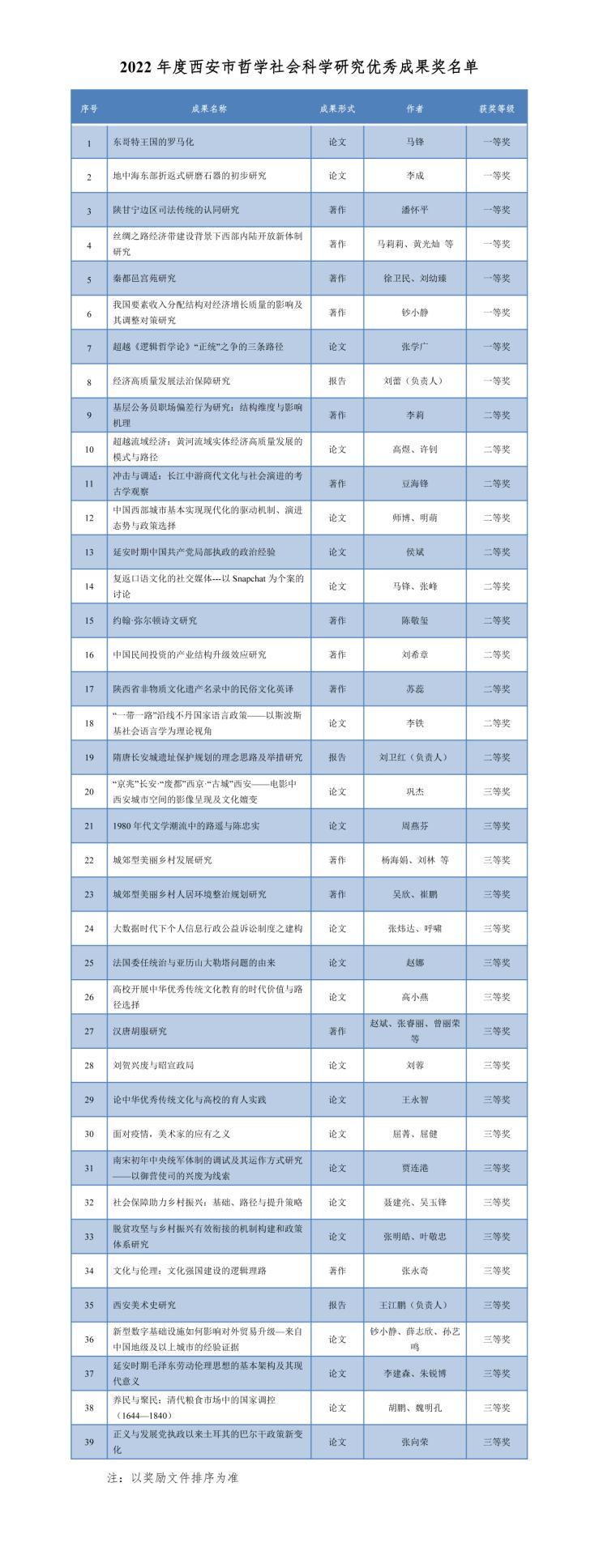 近日,西安市哲学社会科学成果等级评定委员会办公室公布了2022年度西安市哲学社会科学研究成果等级评定结果,本次评选产生入选成果220项,其中一等奖30项,二等奖50项,三等奖140项。