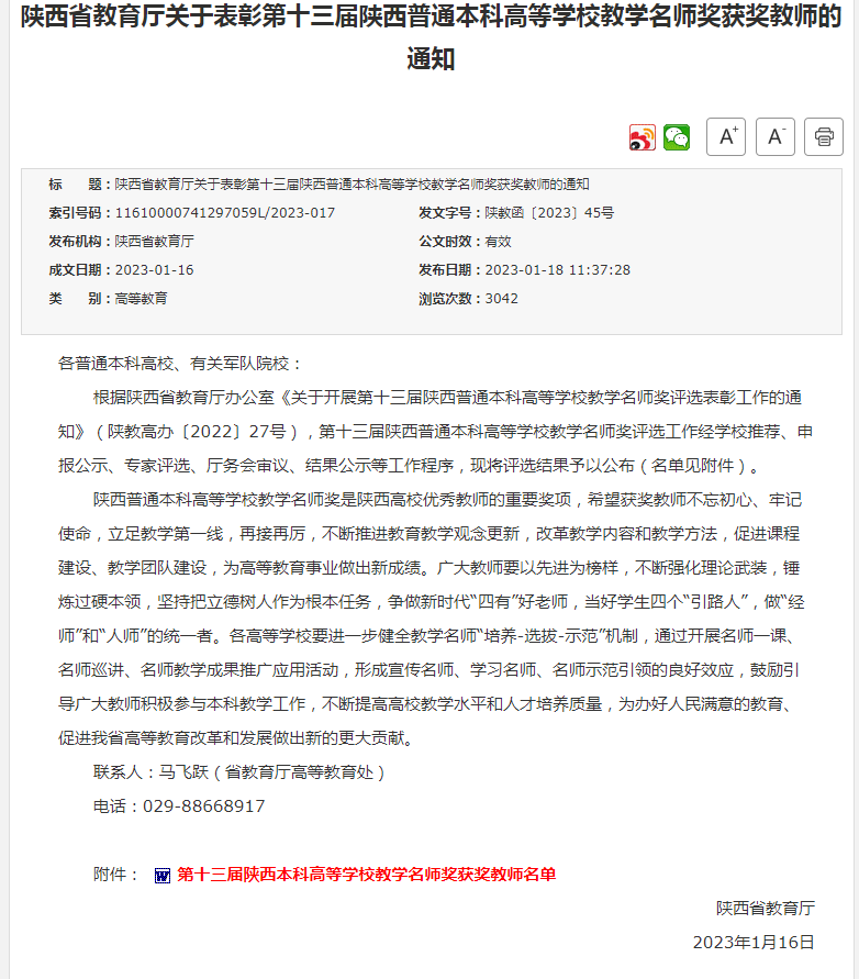 陕西普通本科高等学校教学名师奖是陕西高校优秀教师的重要奖项,是鼓励高校坚持以育人为中心的重要举措。乐鱼网页版页面登录历来重视对教学能力的培养,积极引导教师潜心教学。学校紧紧围绕人才培养目标,通过一流课程建设、教学名师工作室建设、教学团队建设、课程“教学能手”与“教学标兵”、课堂教学创新大赛等工作不断促进教师教学能力提升。同时学校修订教师评价机制,完善教学表彰奖励制度,突出教学成果和工作绩效,引导教师不断更新教学观念,改革教学内容和教学方法,努力提高教学水平和人才培养质量。
