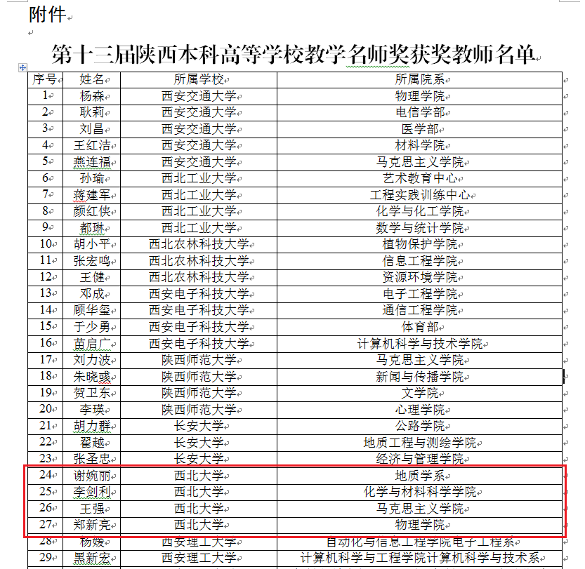 近日,陕西省教育厅发布了《关于表彰第十三届陕西普通本科高等学校教学名师奖获奖教师的通知》,乐鱼网页版页面登录地质学系谢婉丽教授、化学与材料科学学院李剑利教授、马克思主义学院王强教授、物理学院郑新亮教授等4位教师获此殊荣。截至目前,乐鱼网页版页面登录共有国家有关人才计划教学名师4人、国家级教学名师4人、省级教学名师40人。