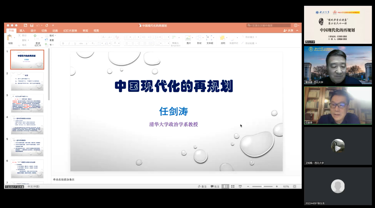 11月25日晚,清华大学任剑涛教授做客乐鱼网页版页面登录“侯外庐学术讲座”第261讲,在线为师生作了题为“中国现代化的再规划”的学术报告。公共管理学院(应急管理学院)雷晓康教授主持讲座,来自清华大学、南京大学等20多所高校的300余名师生参与了此次讲座。