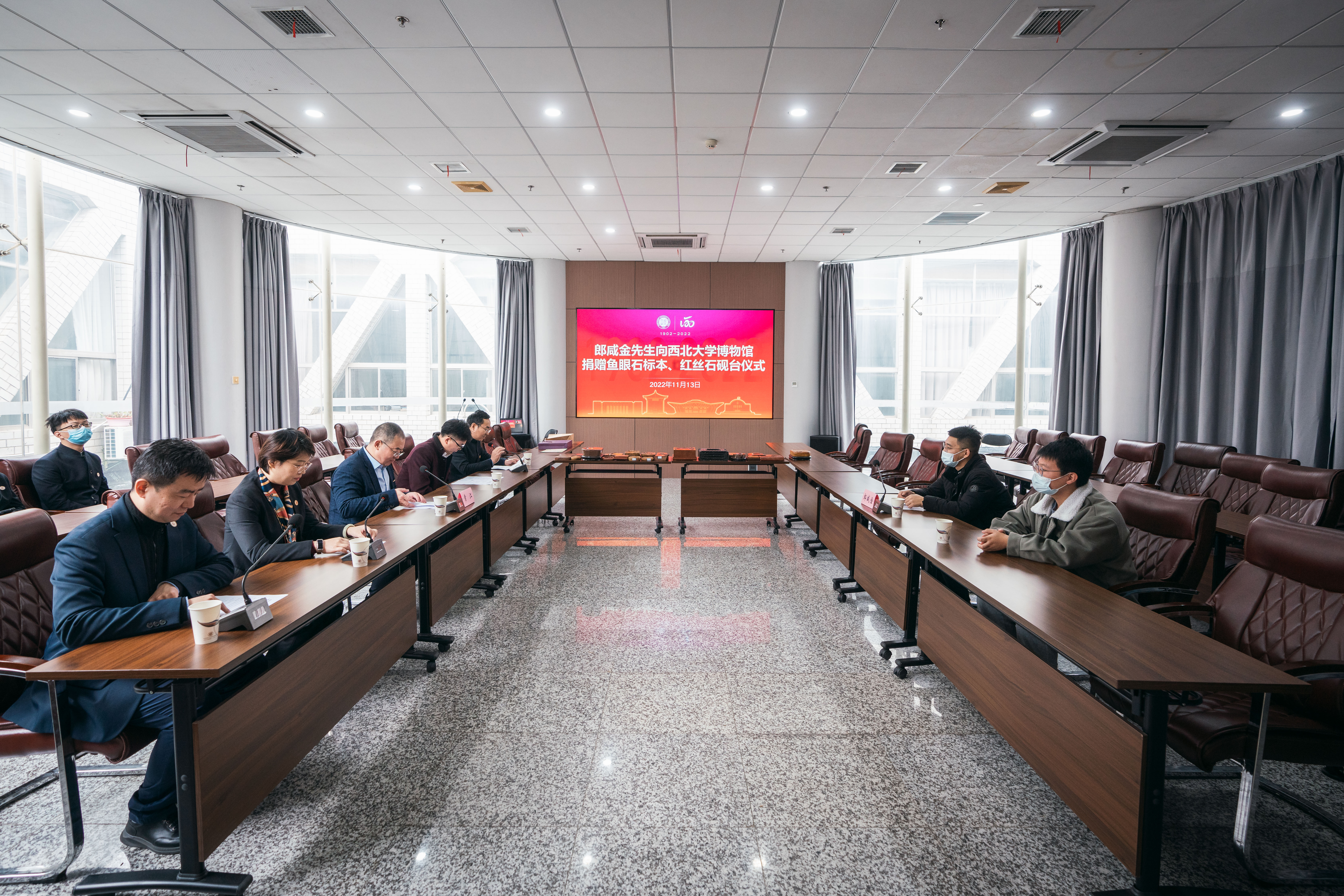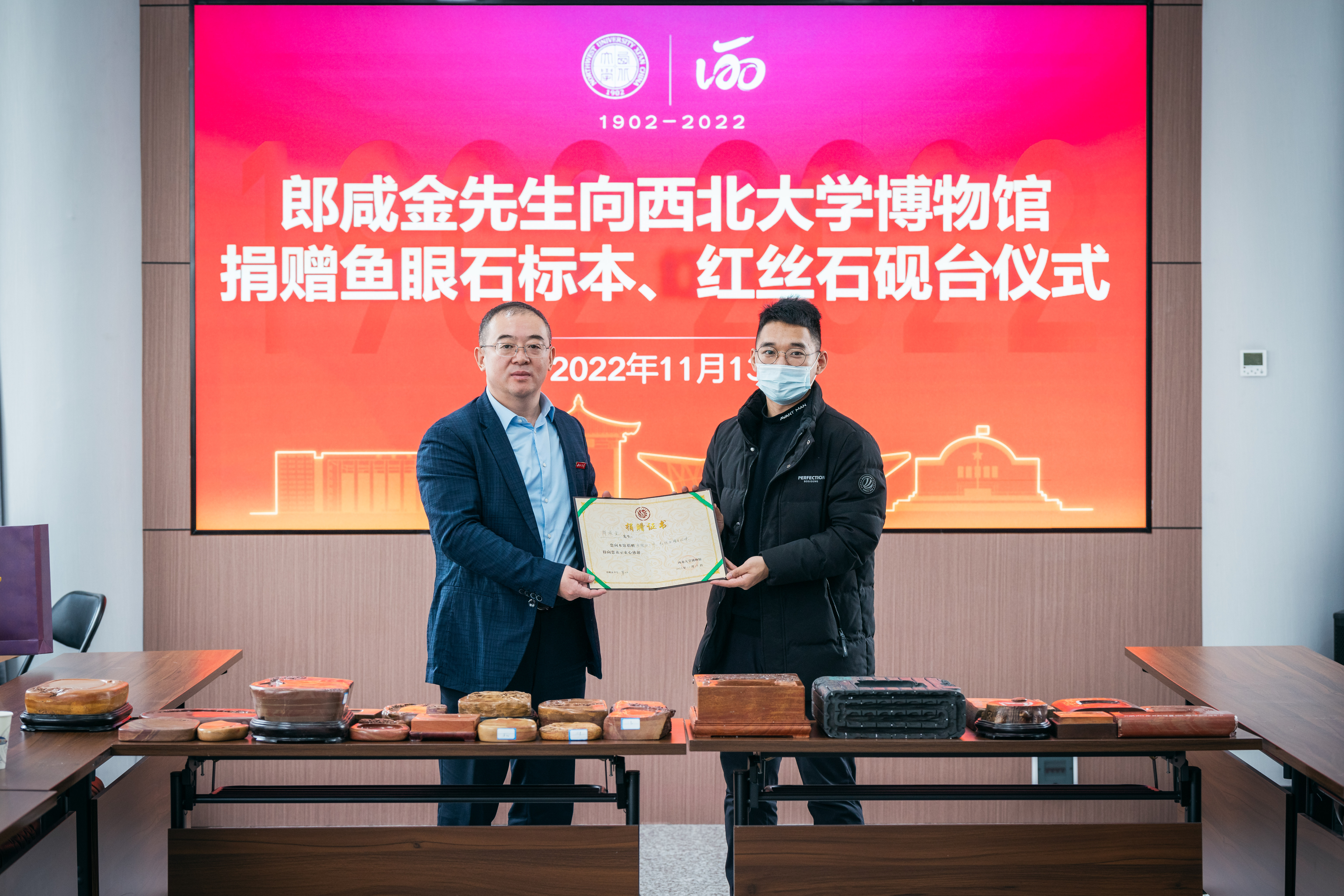 11月13日,郎咸金先生向乐鱼网页版页面登录博物馆捐赠鱼眼石标本、红丝石砚台仪式在我馆隆重举行。校党委常委、副校长常江,郎咸金先生,学校图书馆、博物馆相关负责人参加仪式。仪式由博物馆相关负责人主持。