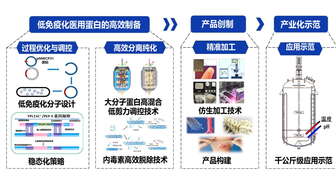 “医用蛋白的绿色生物制造关键技术及应用”项目由乐鱼网页版页面登录联合北京化工大学、天津大学、中国农业科学院生物技术研究所、通化安睿特生物制药股份有限公司、西安巨子基因技术股份有限公司等九家单位申请,项目经费2962万元,项目负责人为乐鱼网页版页面登录化工学院米钰教授。蛋白类物质在疾病的预防、治疗、组织修复及抗菌方面展现出巨大潜力,但是产量低、成本高、免疫原性高等缺陷极大地限制了其临床应用。在“绿色发展”理念的指导下,以合成生物学技术开发低免疫原化医用蛋白生物制造这一变革性生产模式,逐渐成为近些年国内外科研界和产业界的关注焦点。本项目依托国家生化工程技术研究中心、化学工程联合国家重点实验室等9个国家级科技创新基地。以绿色生物制造为指导理念,研究内容覆盖“基础研究—技术创新—产业示范”。本项目将重点突破医用蛋白低免疫化的分子设计原理及低免疫化高效表达工程菌构建的适配机制与重组医用蛋白结构均一性、稳定性、后修饰的构效关系和优化机制等关键科学问题。攻克绿色高效的低免疫性高纯医用蛋白分离、纯化、变性与复性技术、痕量宿主DNA 及宿主蛋白快速鉴定技术、高效穿膜肽设计及低免疫性穿膜去皱蛋白分子设计方法、发酵过程辅因子调控、代谢全网络调控、过程放大与优化等一系列关键技术。针对临床医用蛋白的潜在性能和功效缺陷,创制出在组织填充、抗皱、抗菌、溶栓等方面具有特异性功效的生物医用材料,引领国际医用蛋白生物制造。