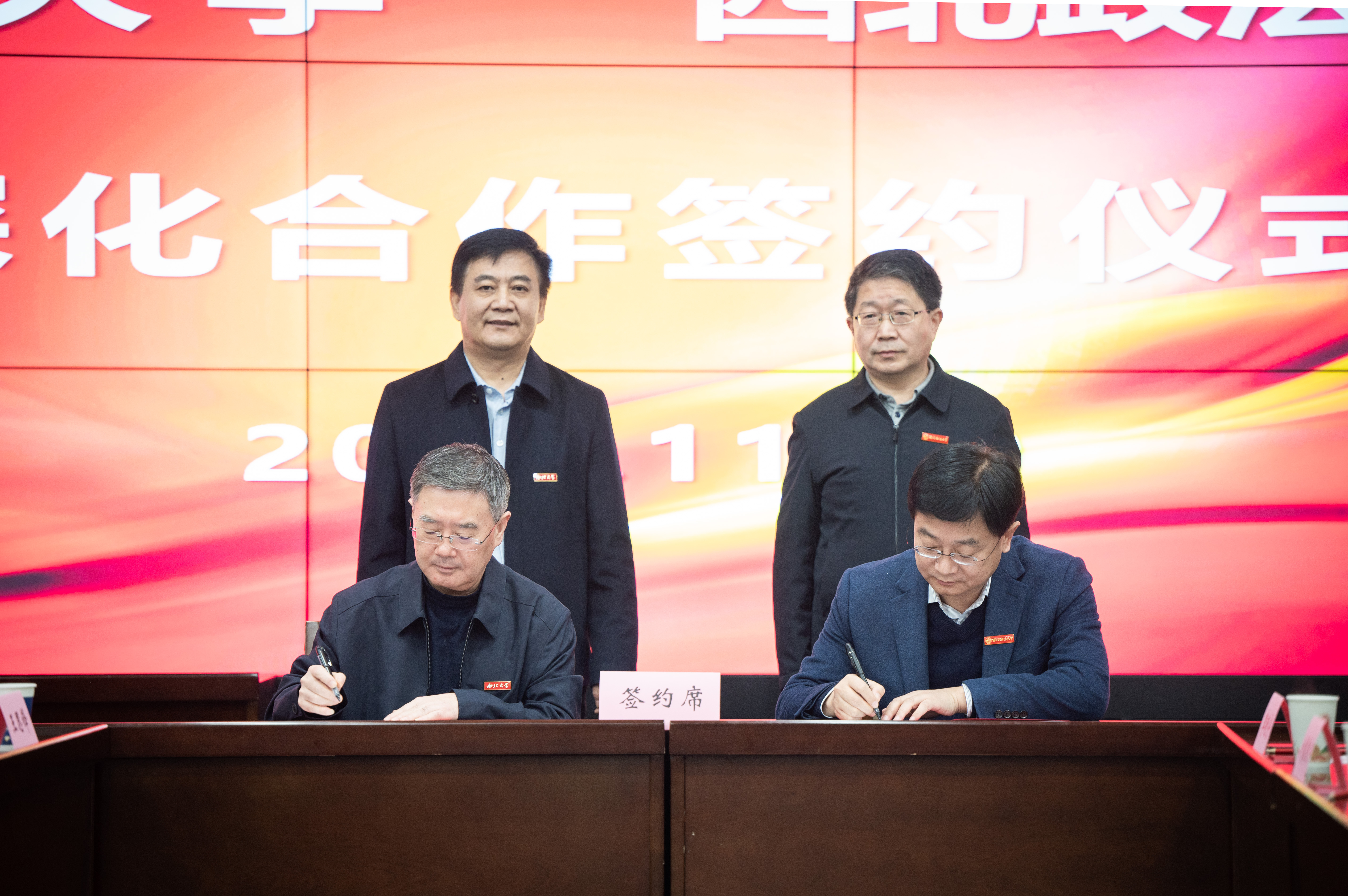 郭立宏、范九利代表双方签署合作协议,王亚杰、孙国华见证签约。