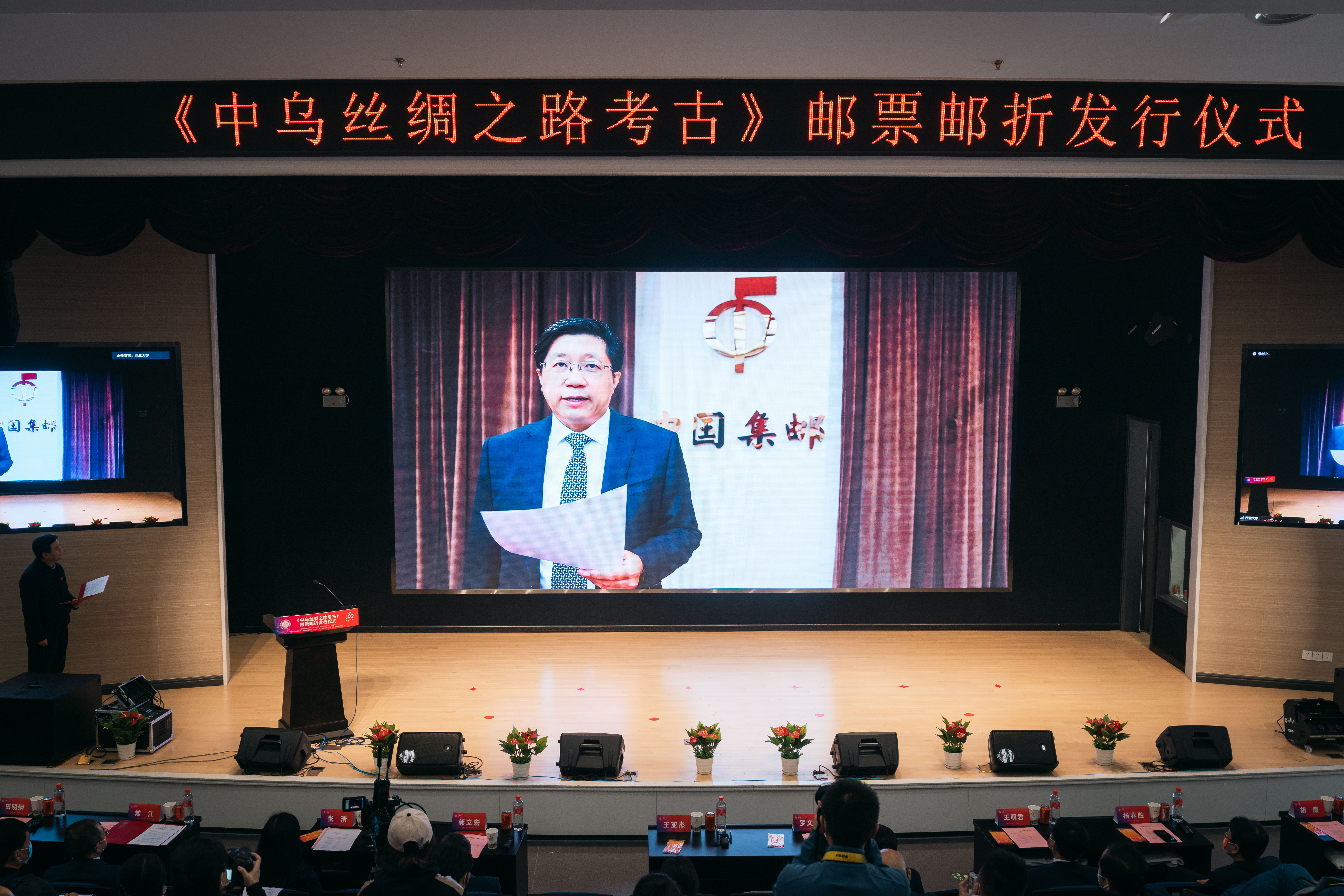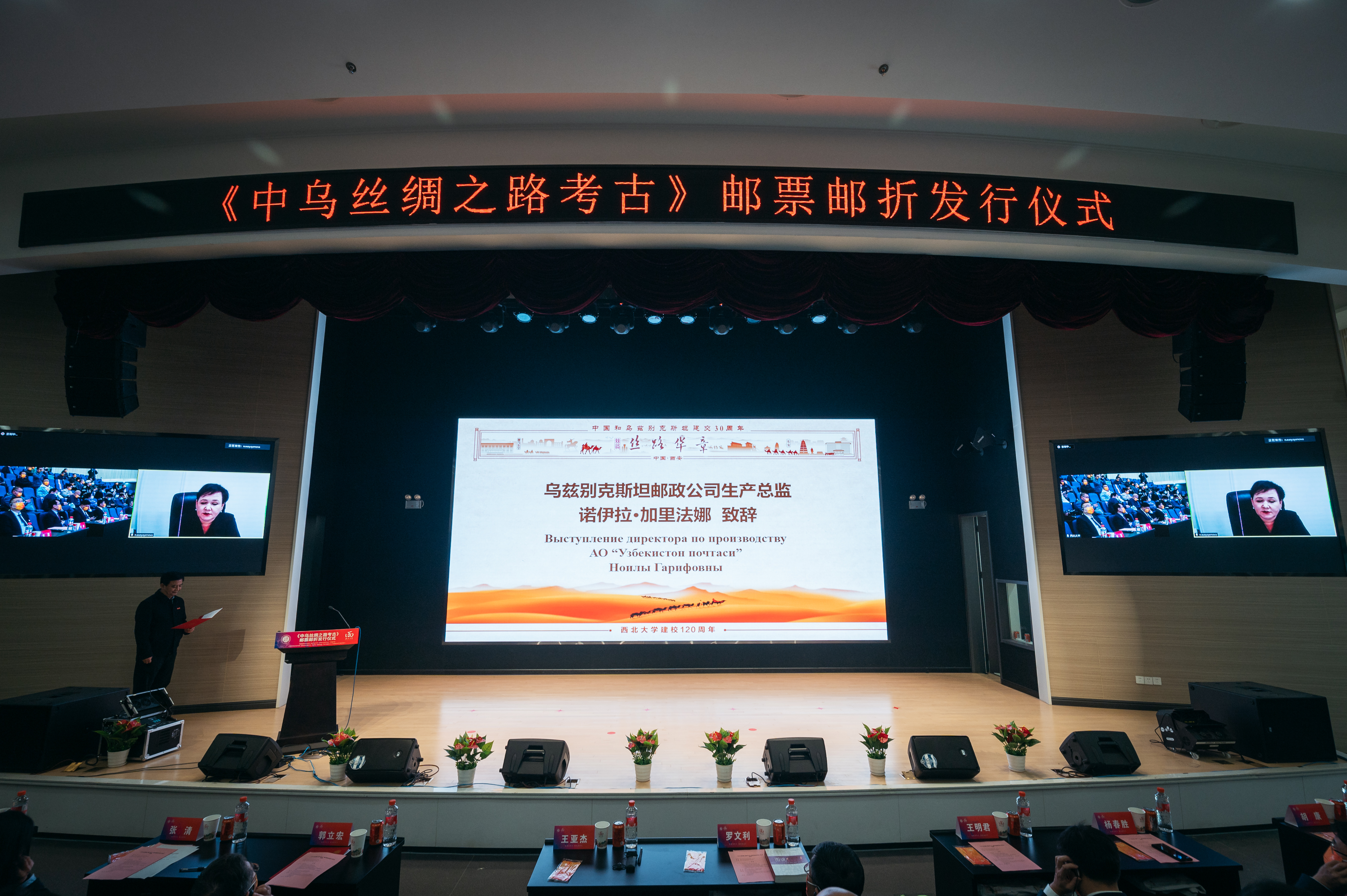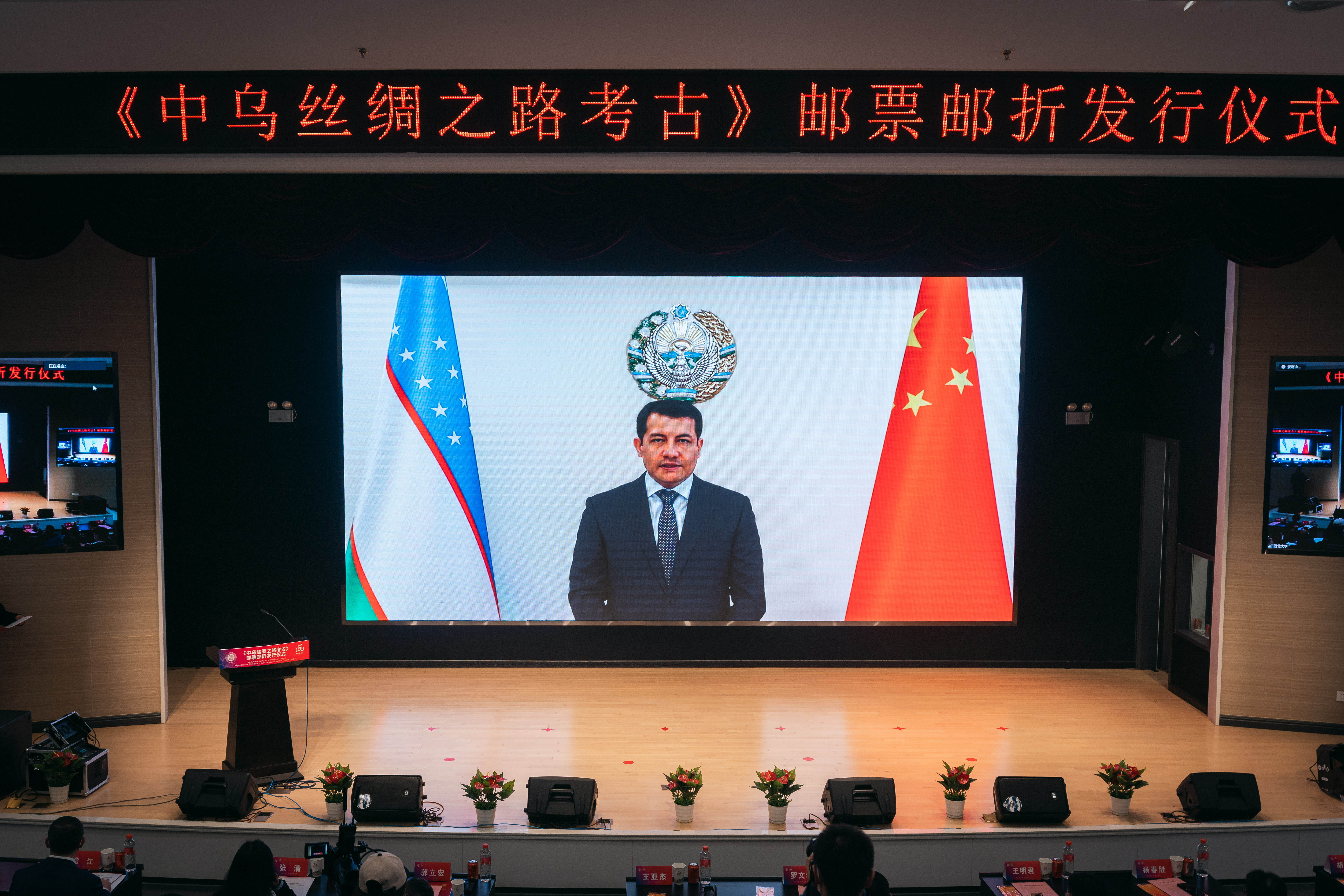 中国驻乌兹别克斯坦大使姜岩,乌兹别克斯坦驻华大使阿尔济耶夫·法尔霍德,中国驻乌兹别克斯坦大使馆文化参赞迟润林,乌兹别克斯坦科学院国家考古中心主任马克苏多夫·法尔霍德,乌兹别克斯坦邮政公司生产总监诺伊拉·加里法娜,新疆维吾尔自治区文化和旅游厅党组书记徐锐军,陕西省文物局党组书记、局长罗文利,陕西省人民对外友好协会专职副会长曹辉,中国集邮有限公司副总经理赵爱国,中国邮政集团有限公司陕西省分公司副总经理王明君、集邮与文化传媒部总经理胡康,中国邮政集团有限公司西安市分公司总经理杨春胜、副总经理李卫国,乐鱼网页版页面登录党委书记王亚杰,校长郭立宏,校党委副书记张清,校党委常委、副校长、120周年校庆总指挥常江,校党委常委、宣传部长田明纲,丝绸之路考古合作研究中心主任赵荣、首席科学家王建新出席仪式。参加仪式的还有省市邮政公司,校外媒体代表,校内相关单位负责人及师生代表以线上线下相结合的方式参会。发行仪式由王亚杰主持。