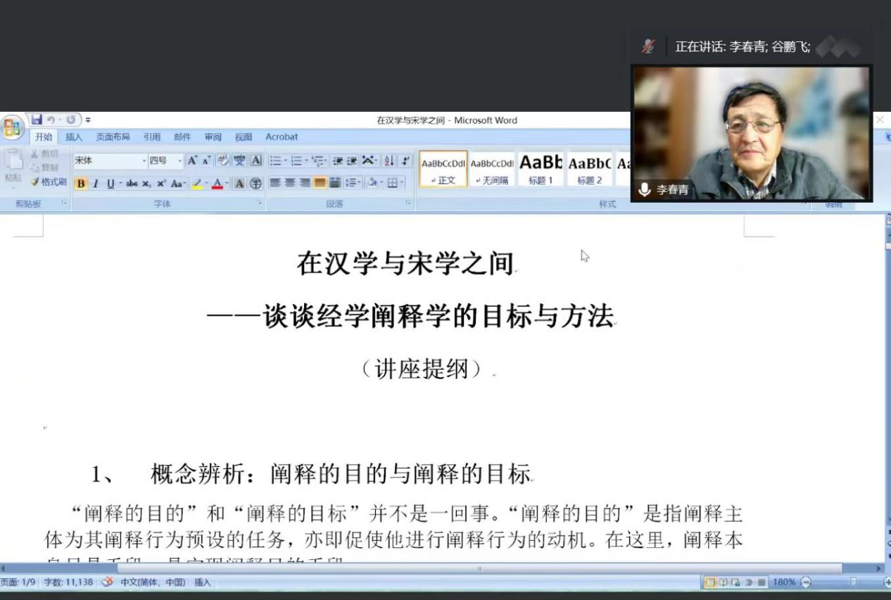 11月3日晚,北京师范大学文学院教授、博士生导师,华南师范大学特聘教授李春青做客乐鱼网页版页面登录“侯外庐学术讲座”,为师生作了题为“在汉学与宋学之间——谈谈经学阐释学的目标与方法”的线上讲座。讲座由文学院谷鹏飞教授主持,乐鱼网页版页面登录相关专业教师以及文艺学、美学等专业的硕、博士研究生听取了本次讲座。