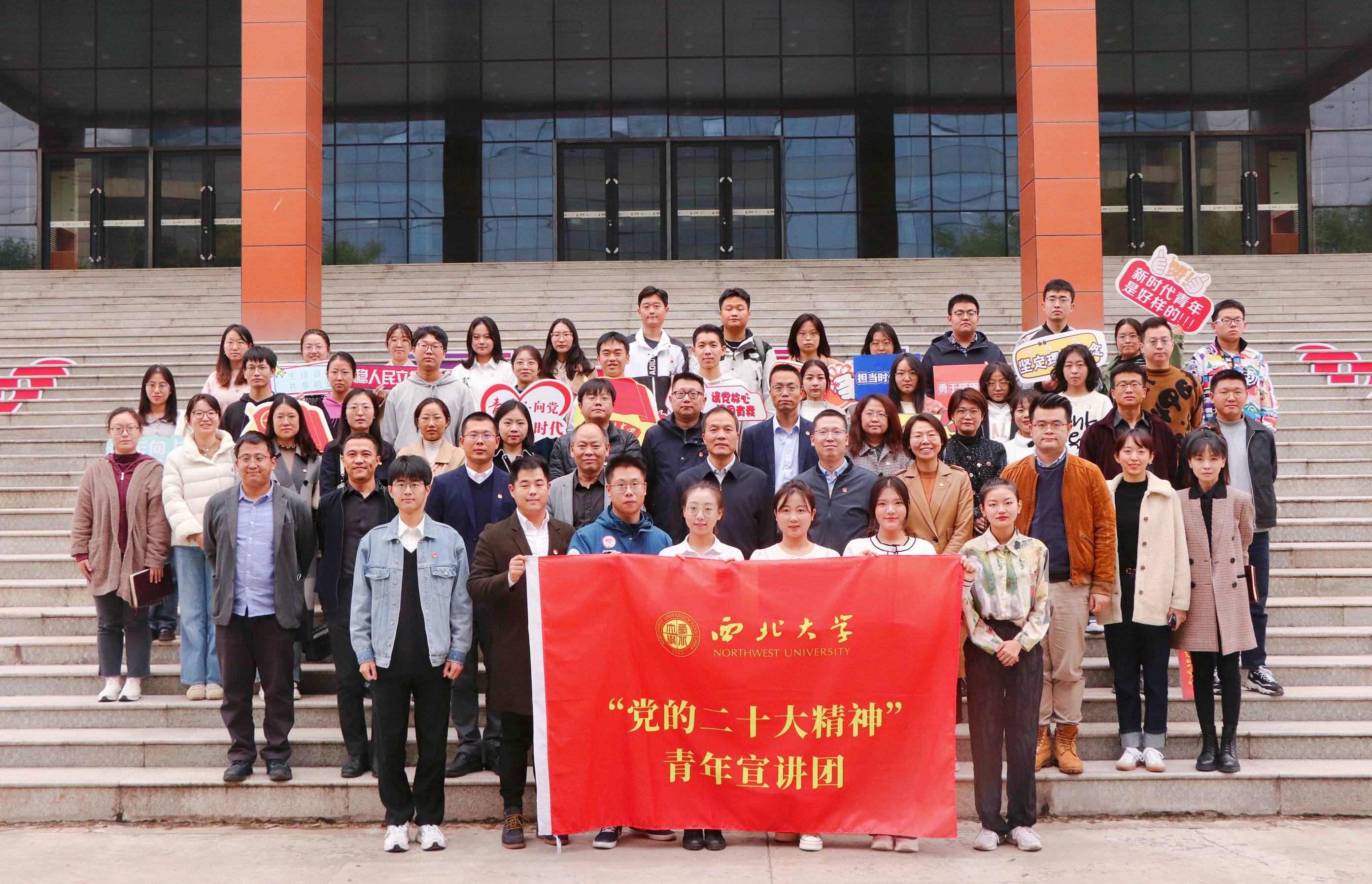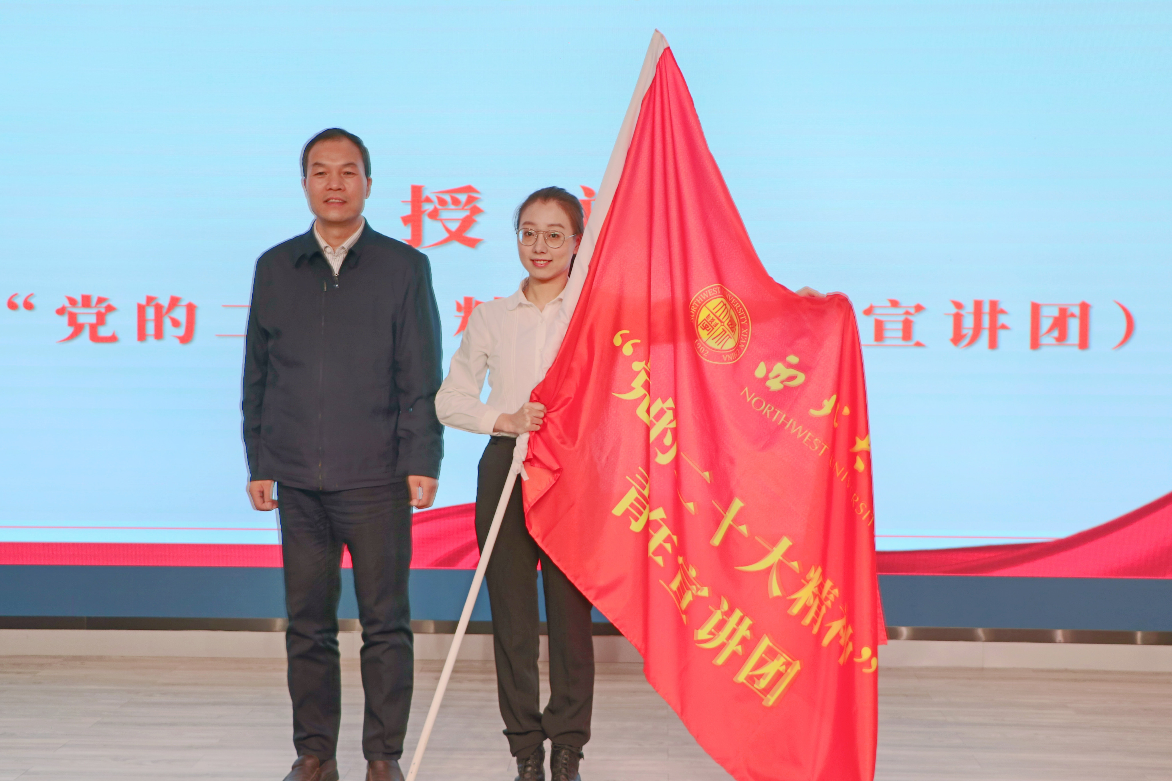 吕建荣向乐鱼网页版页面登录“党的二十大精神”青年宣讲团授旗。史若毓同学代表青年宣讲团接旗。