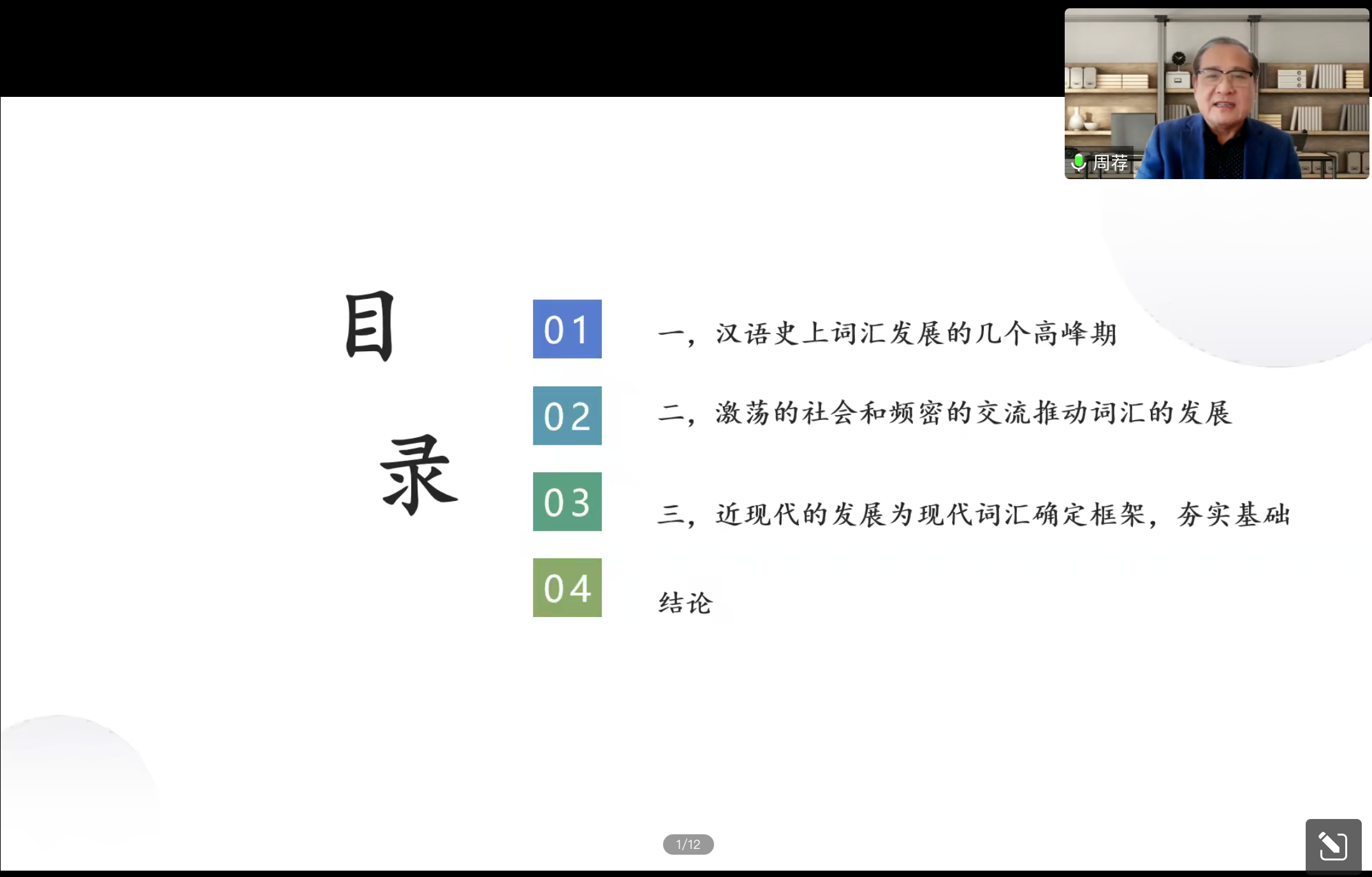 10月12日下午,北京师范大学周荐教授做客乐鱼网页版页面登录“侯外庐学术讲座”第245讲,在线为师生作了题为《中西交流对汉语词汇数百年发展的影响》的学术讲座。讲座由文学院赵小刚教授主持,乐鱼网页版页面登录文学院相关专业师生以及其他兄弟院校师生200余人聆听了讲座。