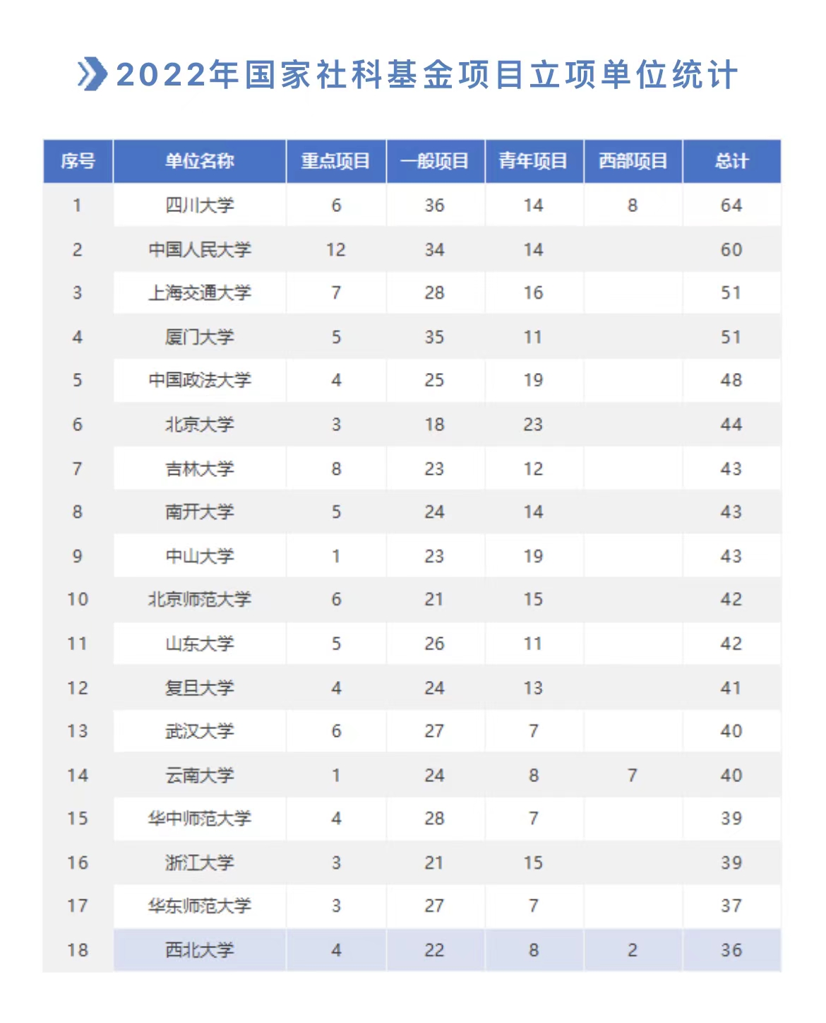 日前,全国哲学社会科学工作办公室公布了2022年国家社科基金年度项目、青年项目、西部项目立项结果,乐鱼网页版页面登录获批国家社科基金项目36项,其中重点项目4项、一般项目22项、青年项目8项、西部项目2项,立项率21.95%。立项数位列全国第18位(并列第12位),陕西省首位。项目立项数在连续高位增长情况下再创新高,项目立项总数和重点项目立项数均创历史最好成绩,立项数保持全国前列。