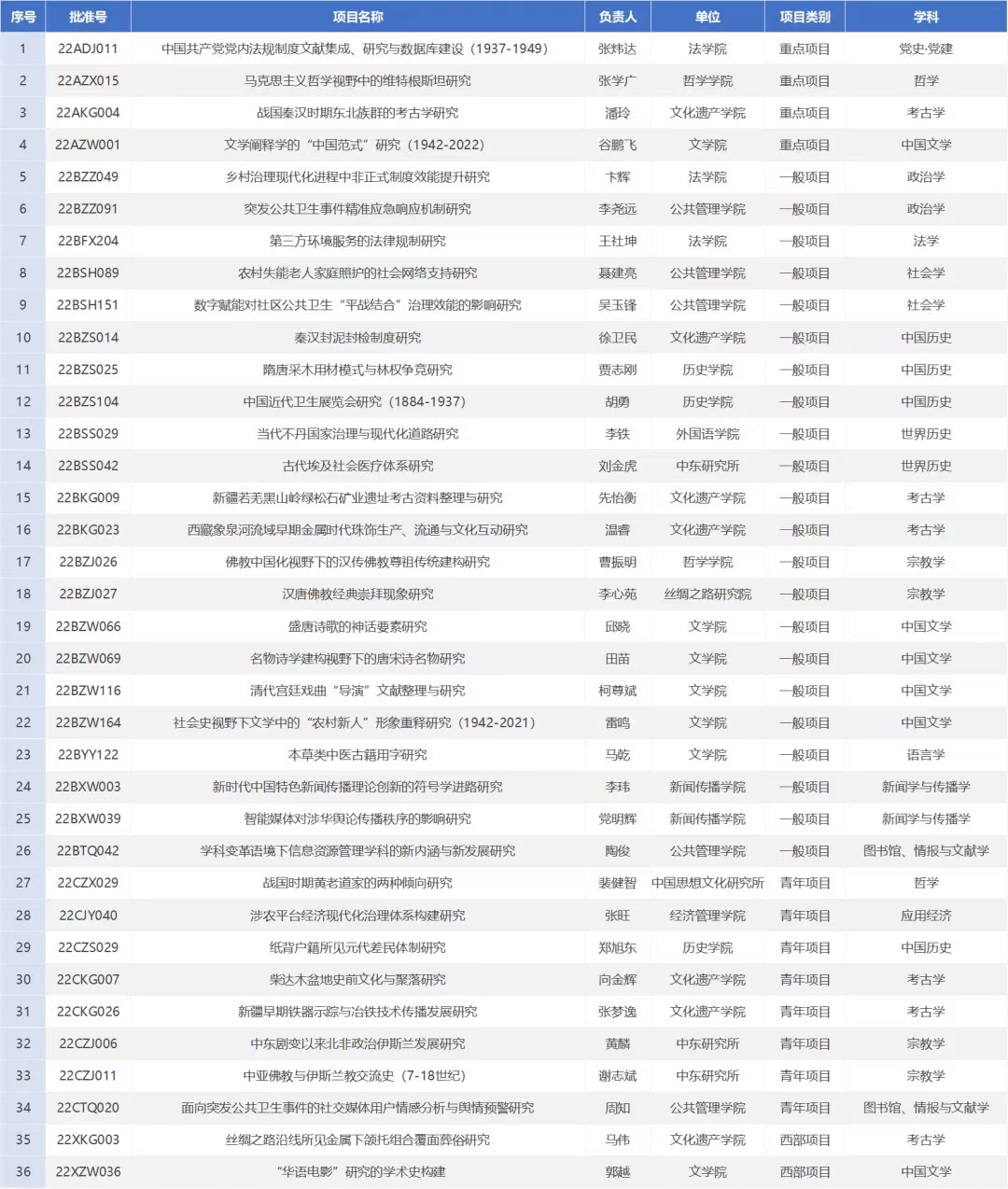 本次立项的36项项目中,考古学、中国文学各6项,宗教学、中国历史各4项,哲学、政治学、社会学、世界历史、新闻学与传播学、图书馆·情报与文献学各2项,党史·党建、应用经济、法学、语言学各1项。在保持传统优势学科的基础上,其他学科显著提升,全面发展。据悉,乐鱼网页版页面登录考古学、宗教学两个学科的立项数位居全国第一。