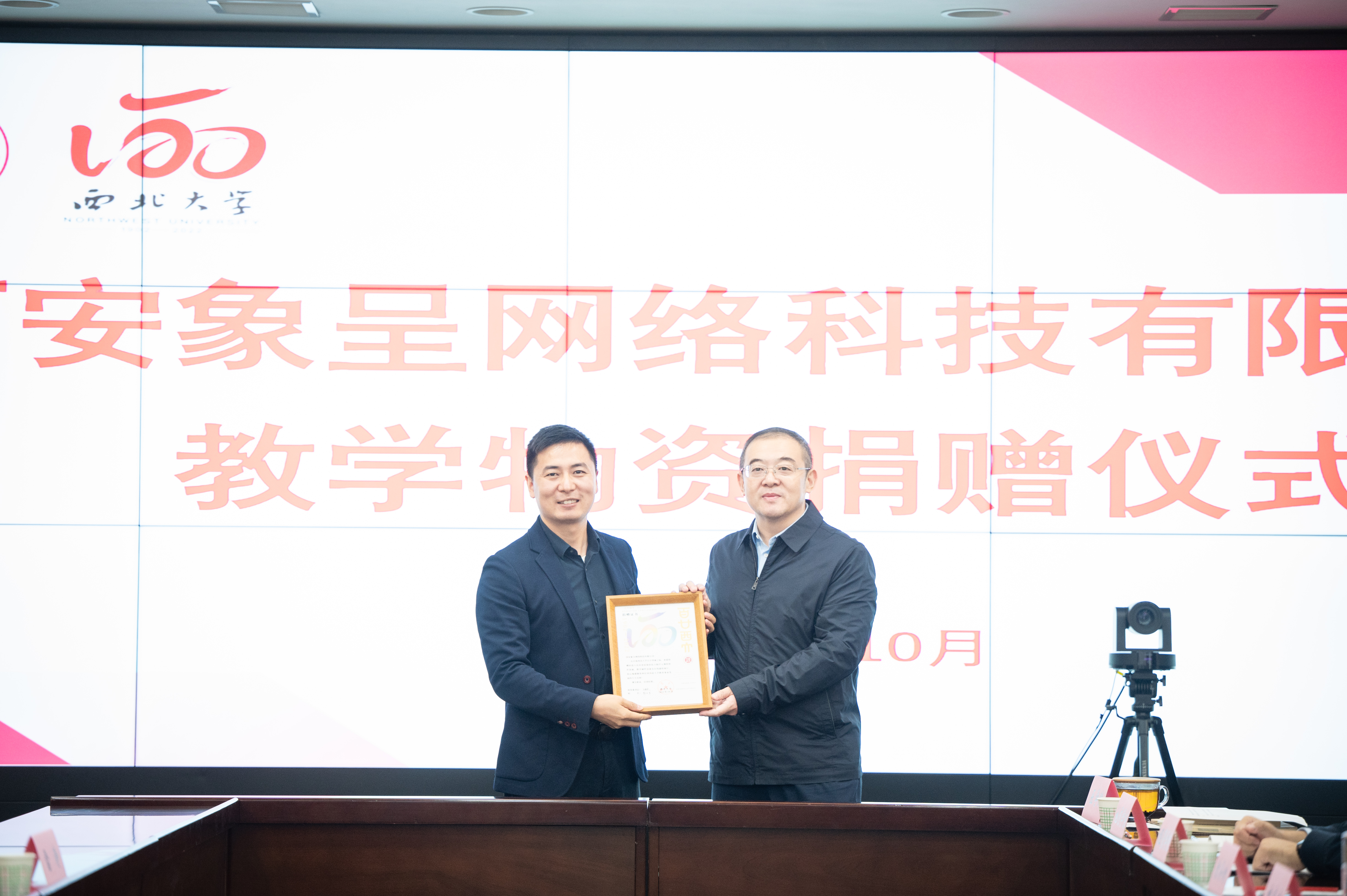 捐赠仪式上,张颖涛、马立军介绍了教学物资捐赠情况。双方代表签订捐赠协议,并进行了教学物资捐赠。常江代表学校为西安象呈网络科技有限公司总经理张明军颁发捐赠证书并赠送了校庆伴手礼。2006级校友张明军代表西安象呈网络科技有限公司在讲话中深情回顾了在校求学经历,表达了关心母校、关注母校、支持母校的深切情感,并对母校120周年华诞表示祝福。