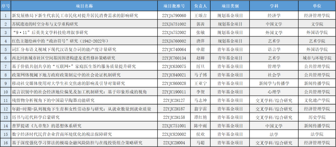 获批立项项目中,规划基金项目4项,青年基金项目12项。在学科分布方面,交叉学科/综合研究4项,中国文学2项,艺术学2项,经济学1项,管理学1项,社会学1项,法学1项,外国文学1项,语言学1项,新闻学与传播学1项,心理学1项。