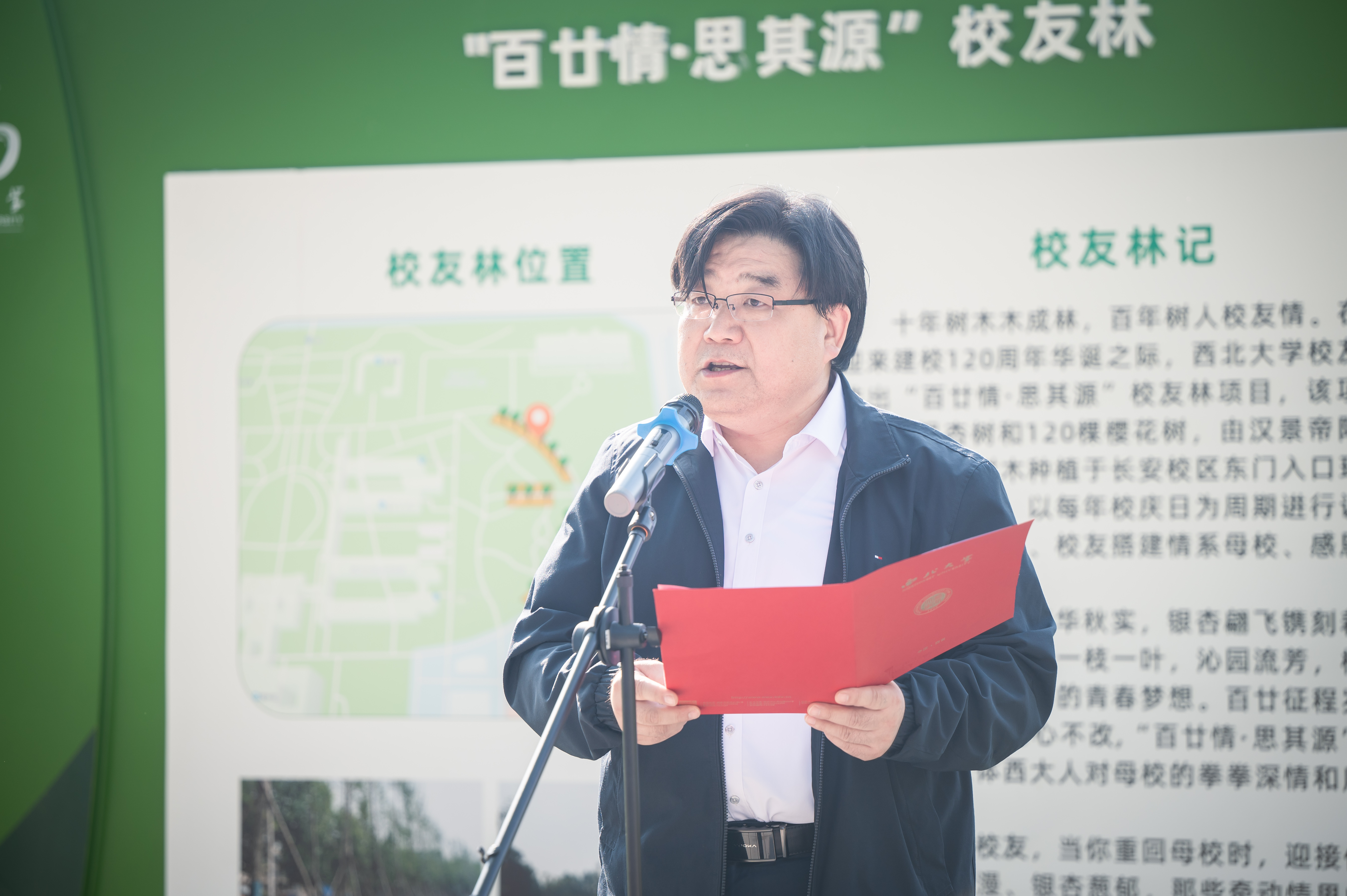 王亚杰代表学校向各位校友、师生的到来表示欢迎,并对长期以来关心和支持母校事业发展的全体师生、海内外校友致以亲切的问候。他表示,此次广大校友参与认养的“百廿情·思其源”校友林是汉景帝阳陵博物院为学校120周年校庆捐赠的特别校庆礼物,这些树木不仅饱含着汉景帝阳陵博物院对学校的祝福,更是多年来学校坚持开放办学,校地合作不断深入,双方发展携手并进、深度融合肝胆相照的友谊见证。他指出,为母校养一棵树、造一片林,既代表着广大校友对母校的深情眷恋,又显示出广大校友对母校发展的衷心牵挂。他强调,校友与母校作为终身的命运共同体,母校时时刻刻关注关心校友的发展,努力构建与校友“血脉相连、精神感召、情感相依、相互支持、交流合作”的“大校友”工作格局,校友的支持是母校最重要的财富,无论大家身处何方,母校永远是校友事业发展的坚强后盾!永远是校友的家!最后,他代表学校再次盛邀全体海内外校友在百廿庆典时欢聚母校,共襄盛典、共商大计。